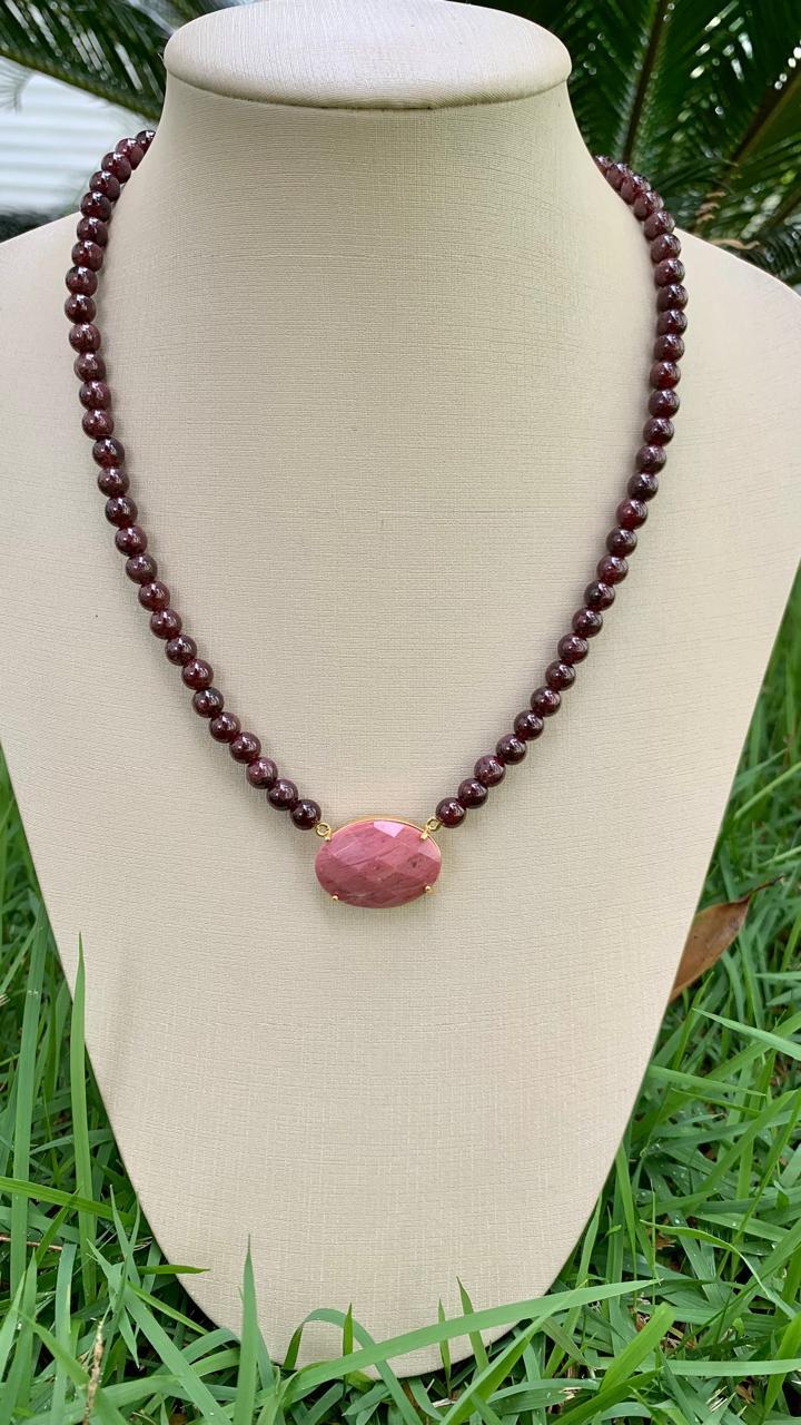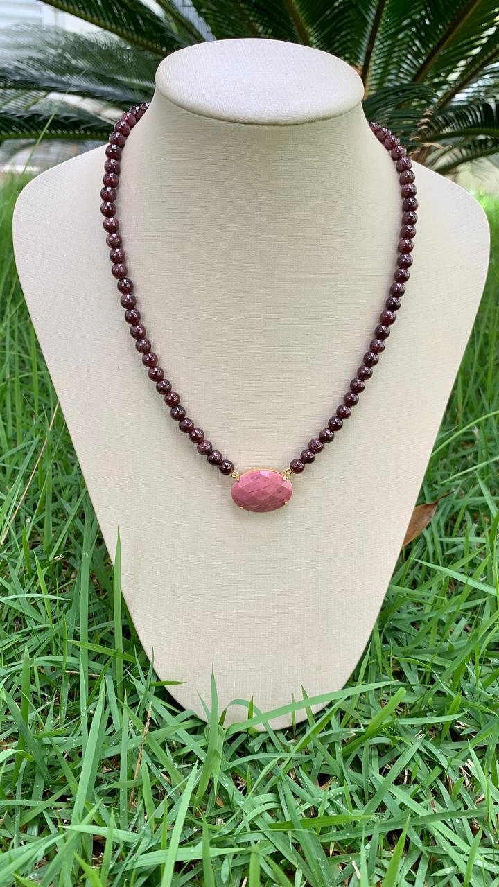 colar de pedra natural granada com pingente rodocrosita, banhado a ouro18k.