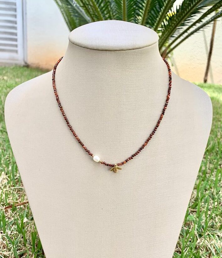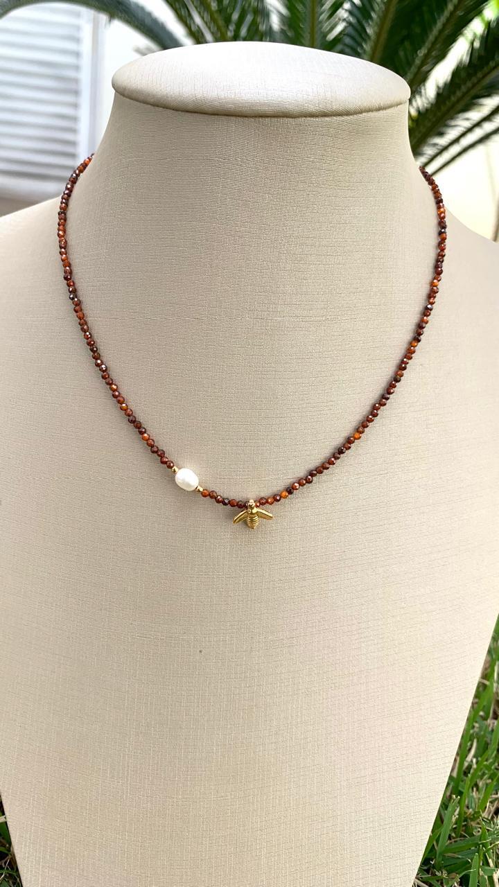 Colar pedra natural granada laranja com pingente de abelha e pérola, banhado a ouro 18k.