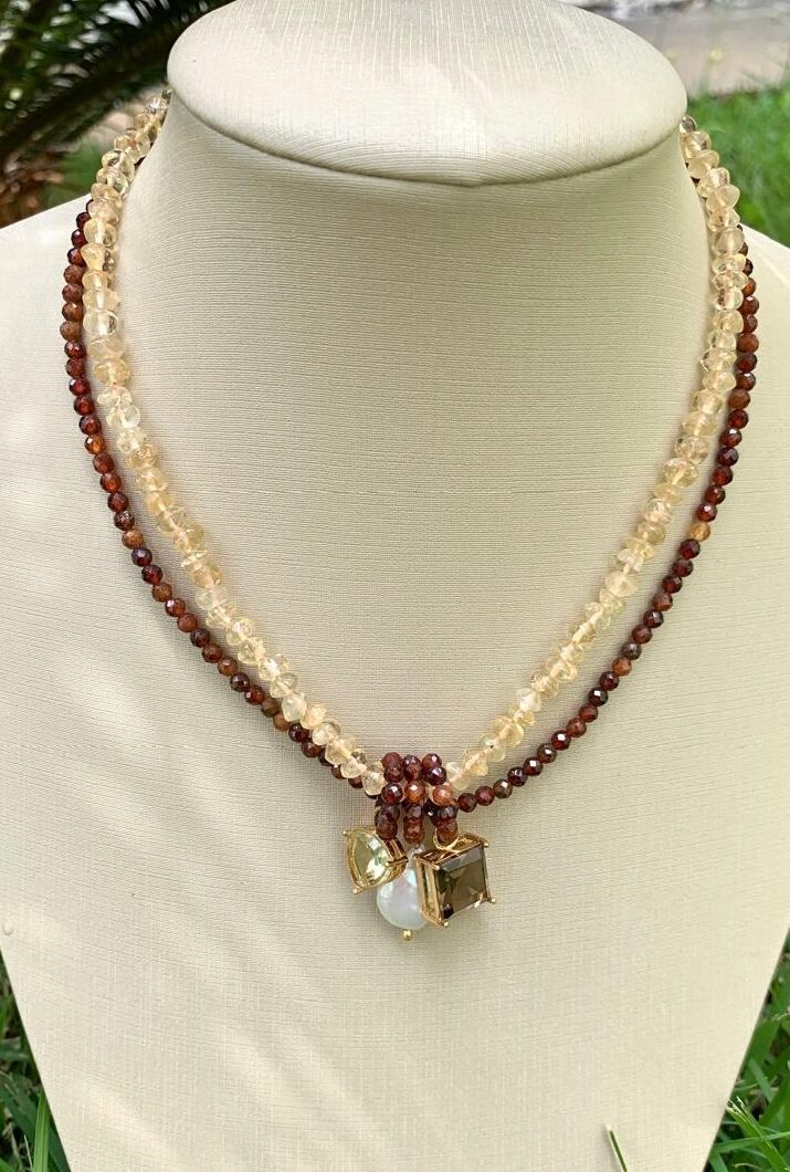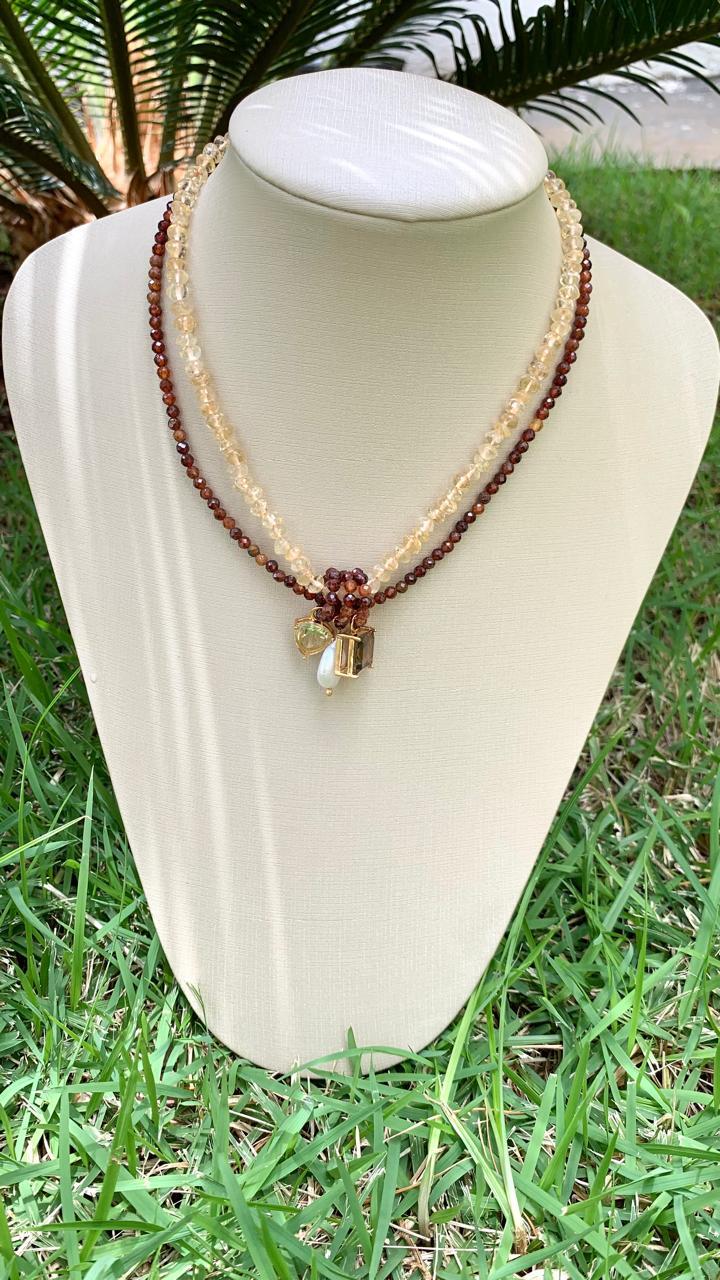 Colar de pedra natural granada laranja e citrino, com pingente de pérola, quartzo fume e citrino, banhado a ouro18k.