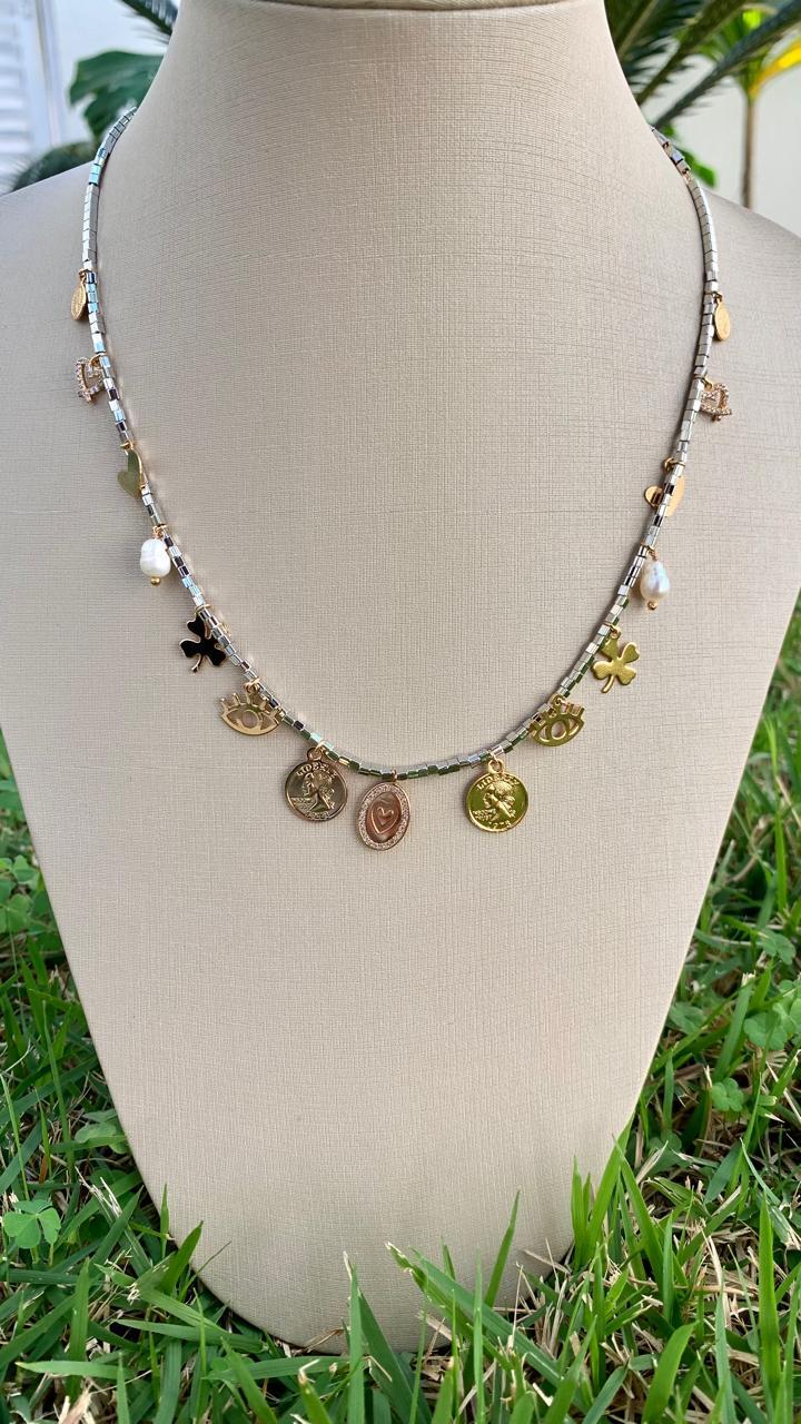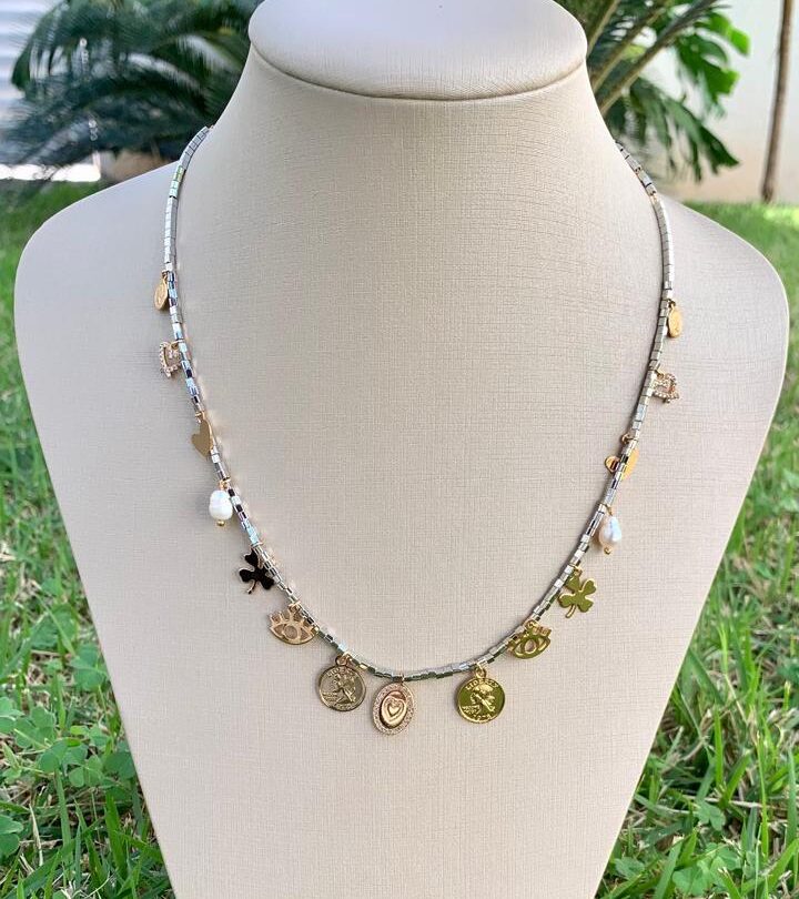 Colar hematita Canutilho com pingentes, banhado a ouro 18k.