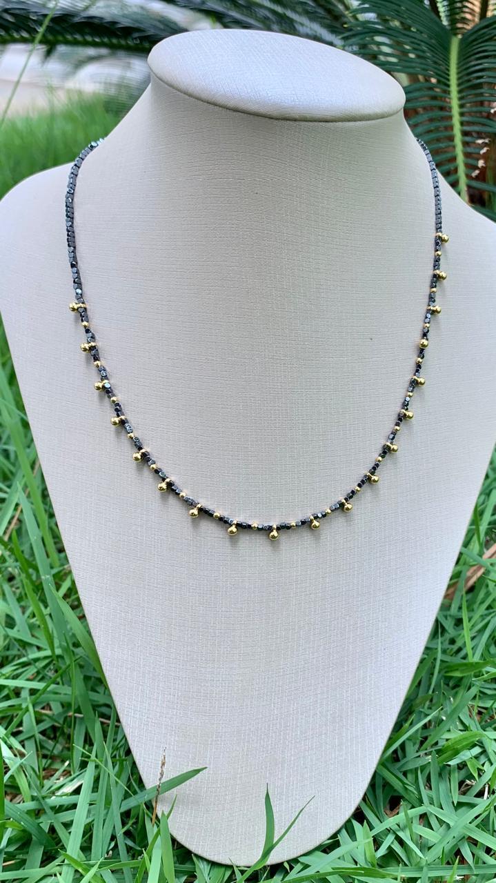 Colar de pedra natural hematita escura com mini esferas, banhado a ouro18k.