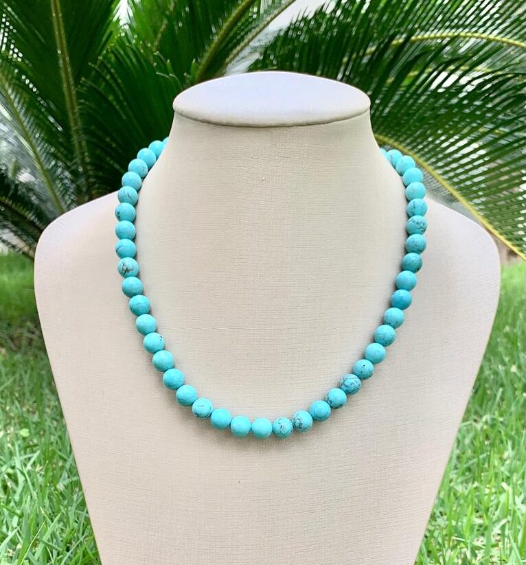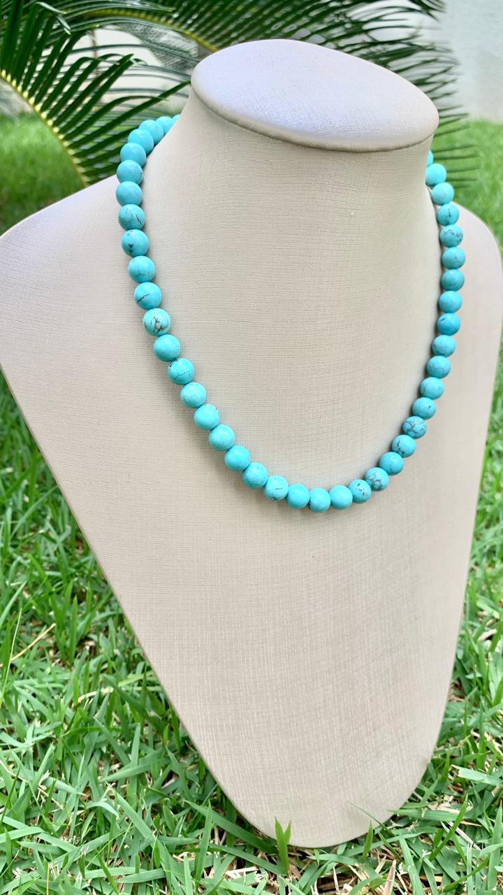 Colar de pedra natural howlita turquesa, com 40cm de comprimento, banhado a ouro 18k. Fecho lagosta.