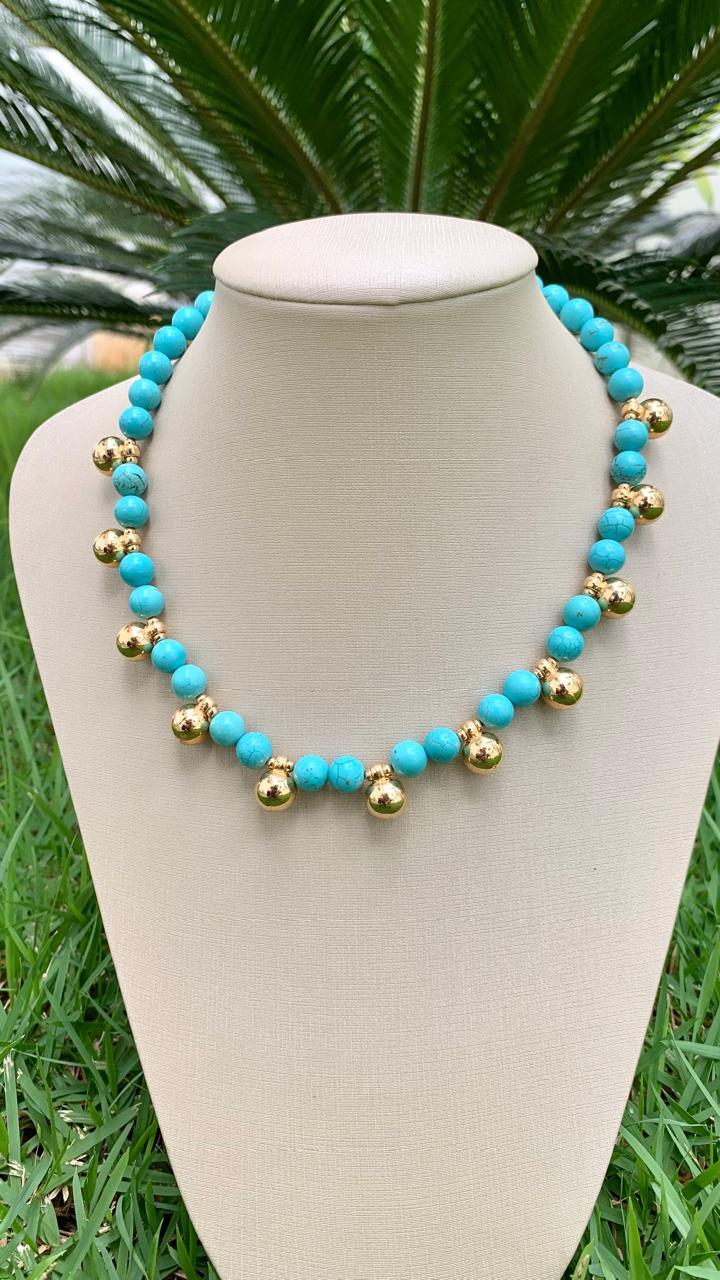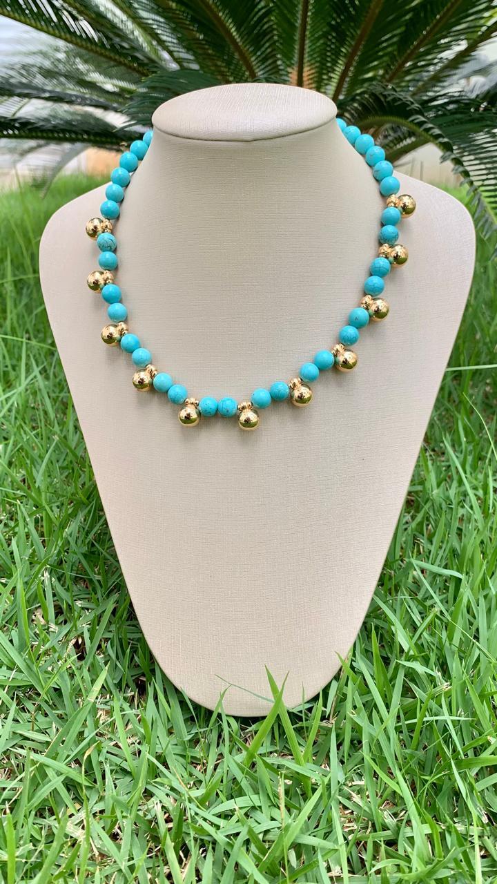 Colar pedra natural howlita turquesa com esferas banhada a ouro18k.