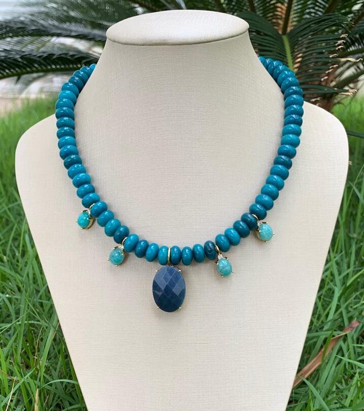 Colar de pedras naturais jade com amazonita, banhado a ouro18k.