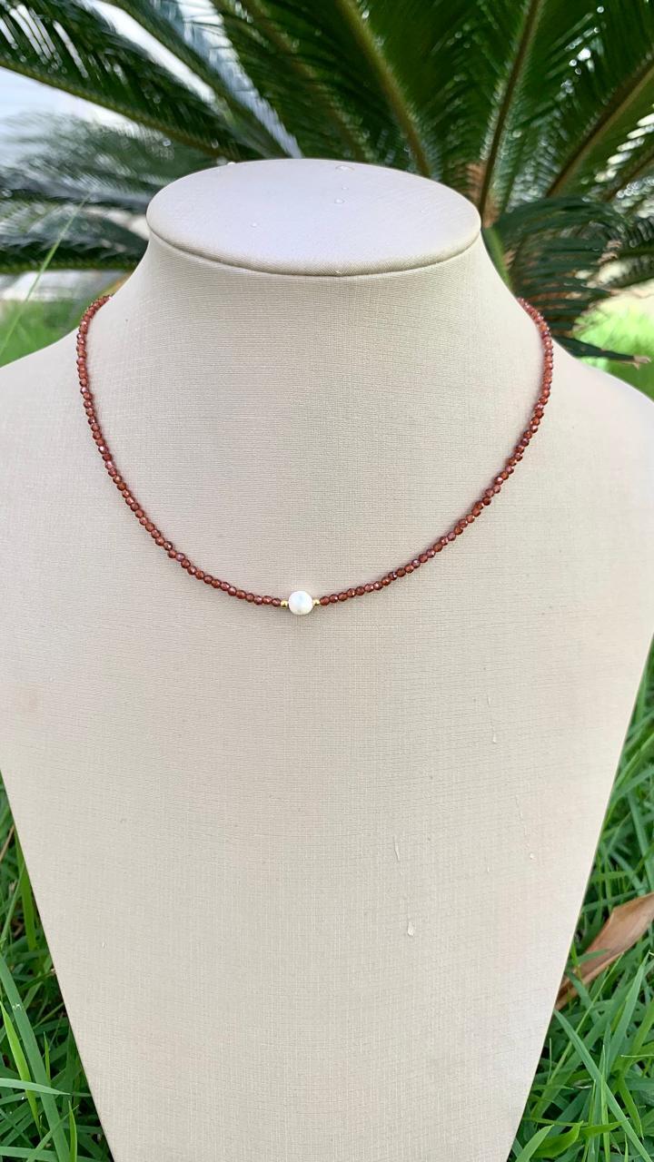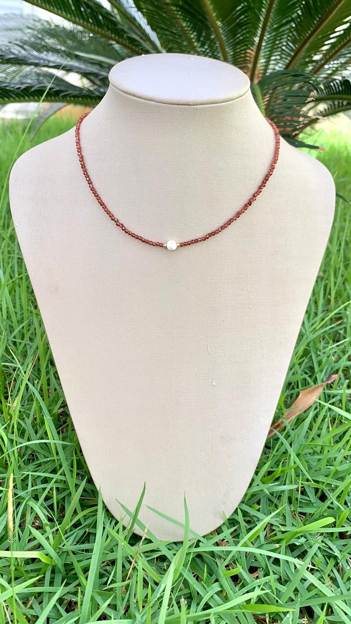 Colar jade marrom com pingente de pérola, banhado a ouro18k.