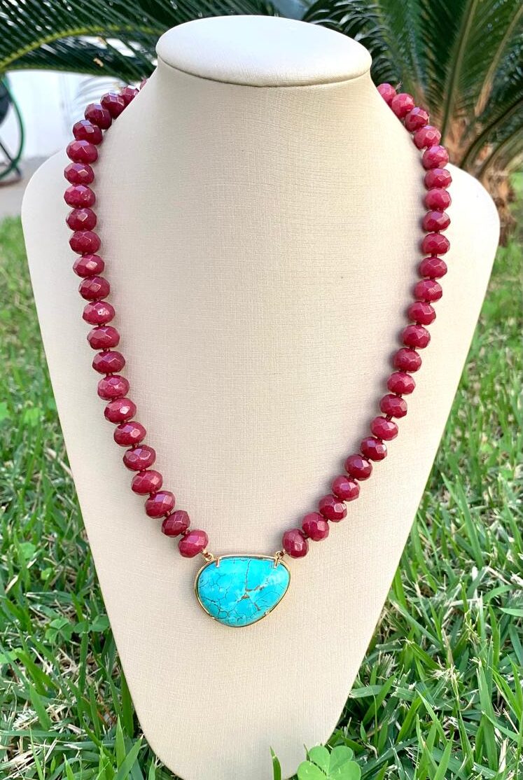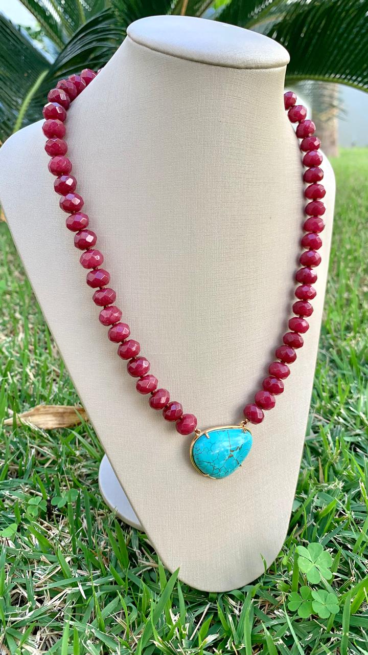 Colar com 45cm de comprimento, de jade rubi com pingente azul turquesa, banhado a ouro 18k.