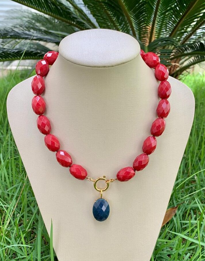 Colar de pedra natural jade vermelha com pingente oval apatita, banhado a ouro18k.