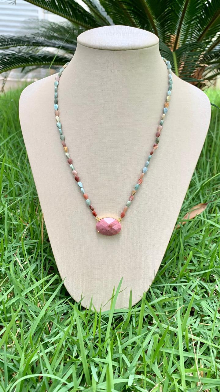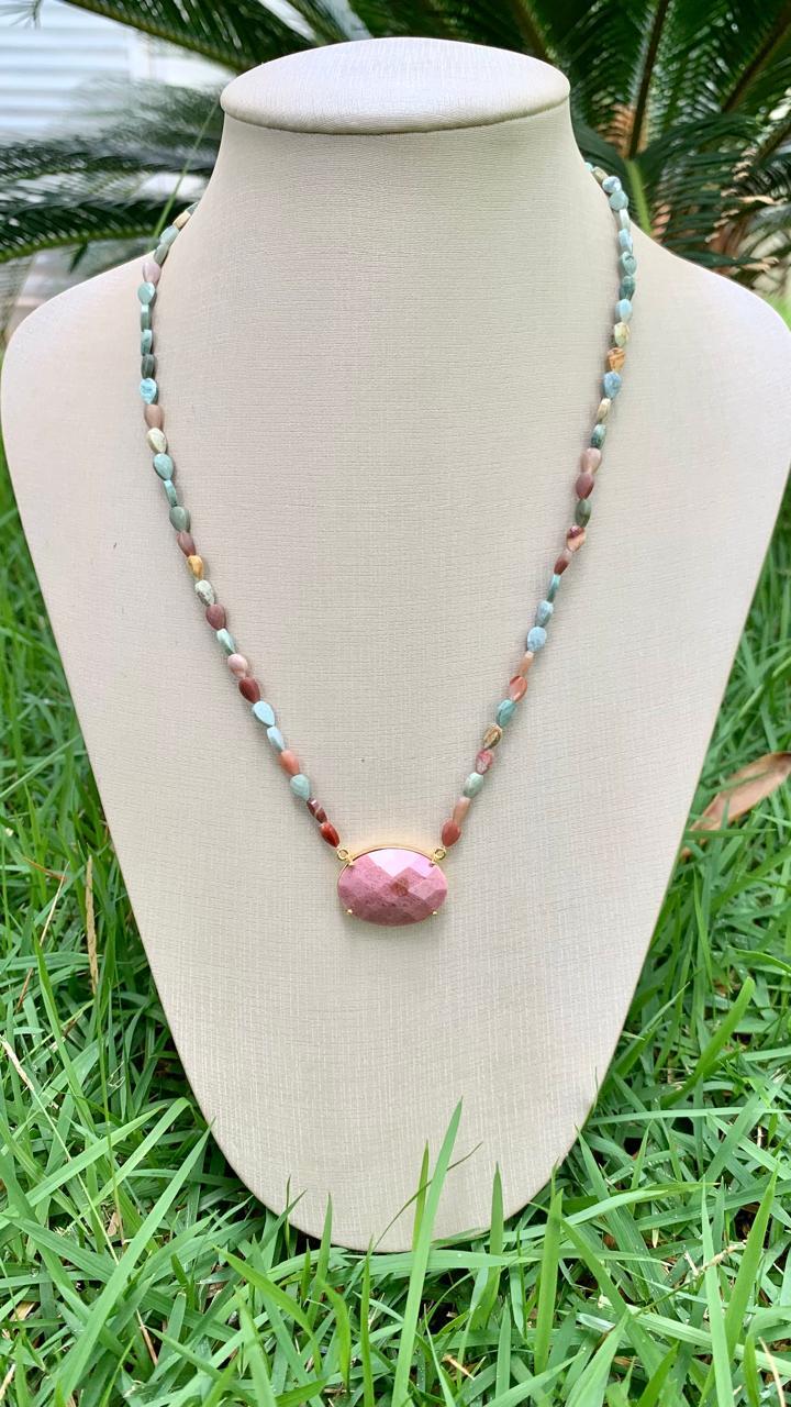 Colar jaspe policromo com pingente rodocrosita, banhado a ouro18k.