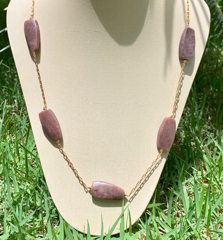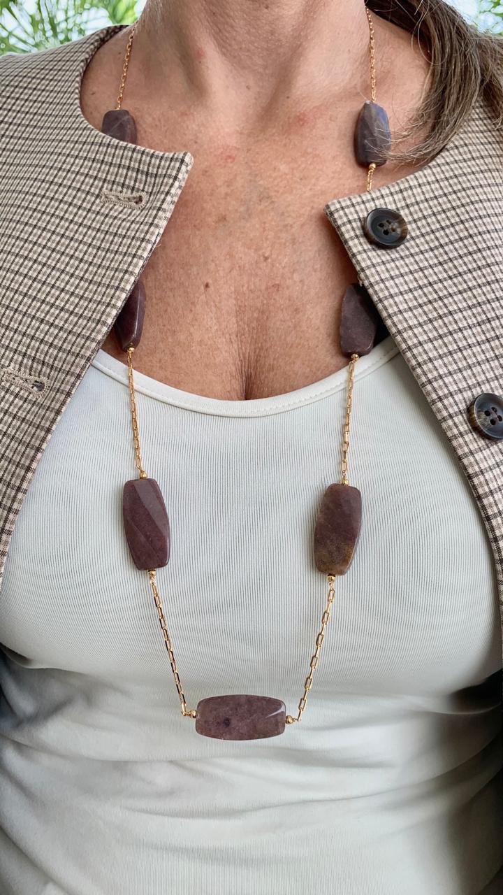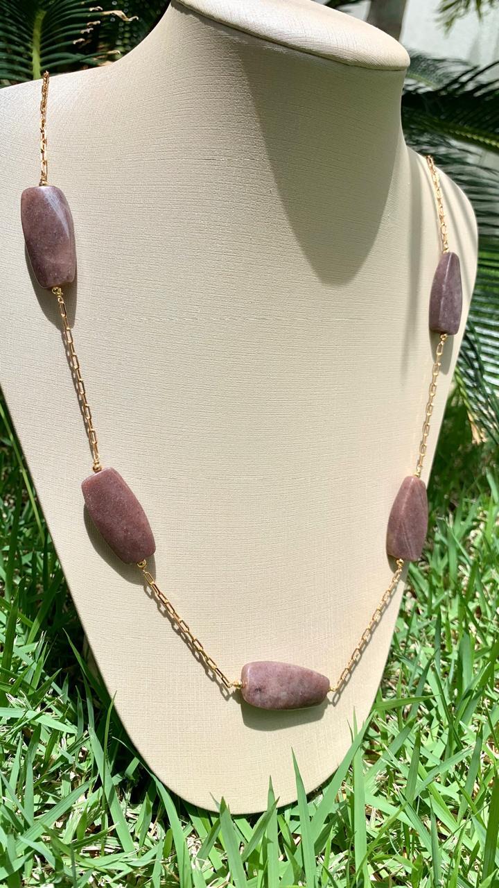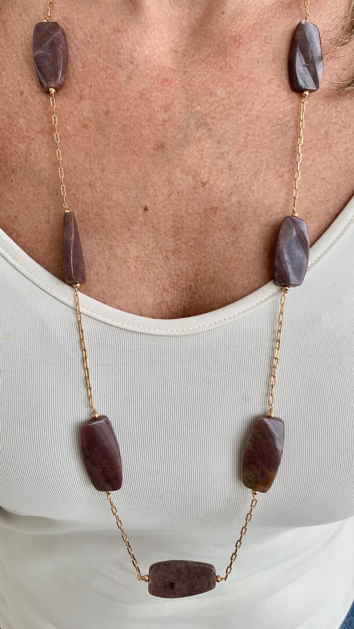 colar longo com pedra natural jade marrom, banhado a ouro18k.