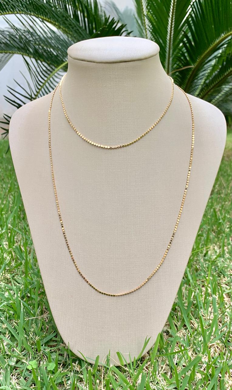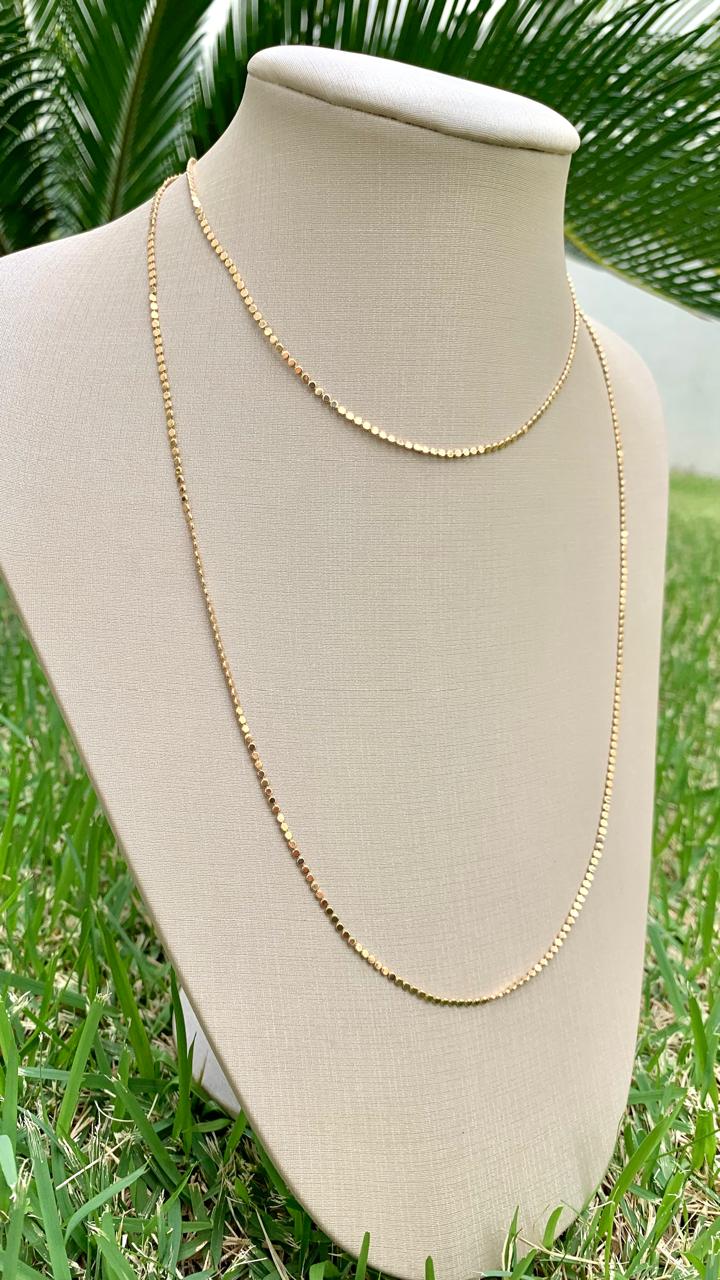 Colar longo com 80cm de comprimento, com chapinhas, banhado a ouro 18k.