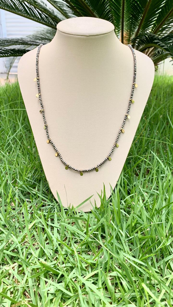 Colar de pedra natural hematita, com 60cm de comprimento, banhado a ouro18k.