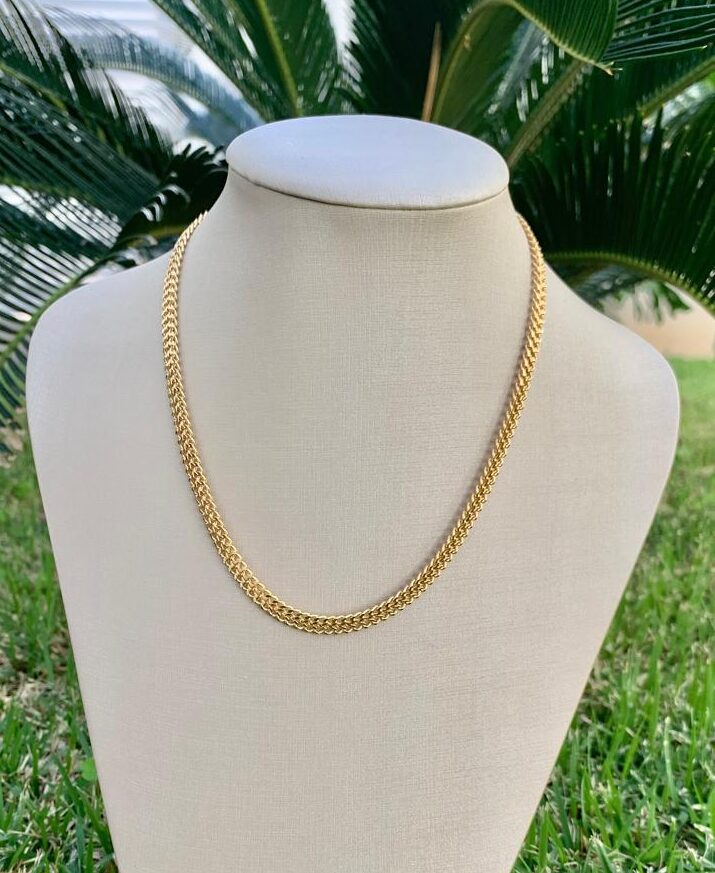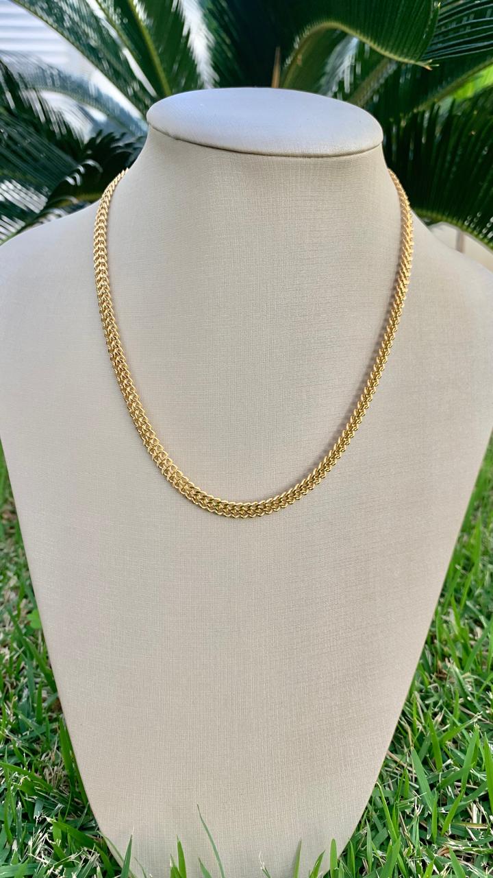 Colar malha, com 40cm de comprimento, banhado a ouro 18k.