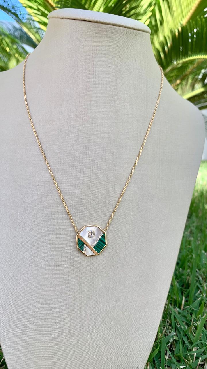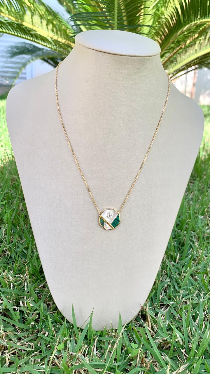 Colar octógono com madrepérola e malaquita em prata 925 com banho de ouro 18k.