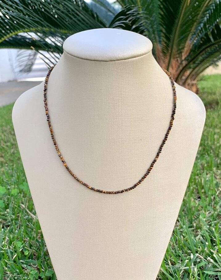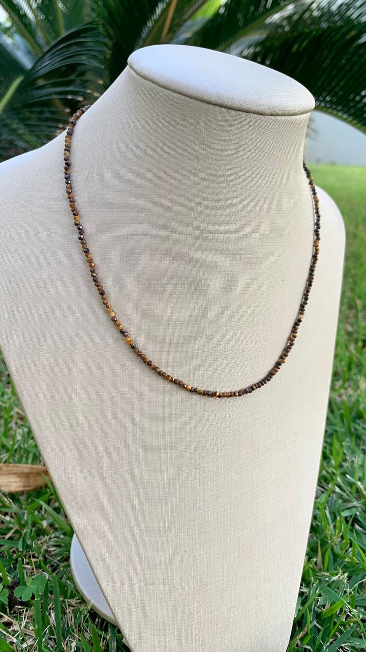 Colar com 40cm de comprimento, de olho de tigre, banhado a ouro 18k.