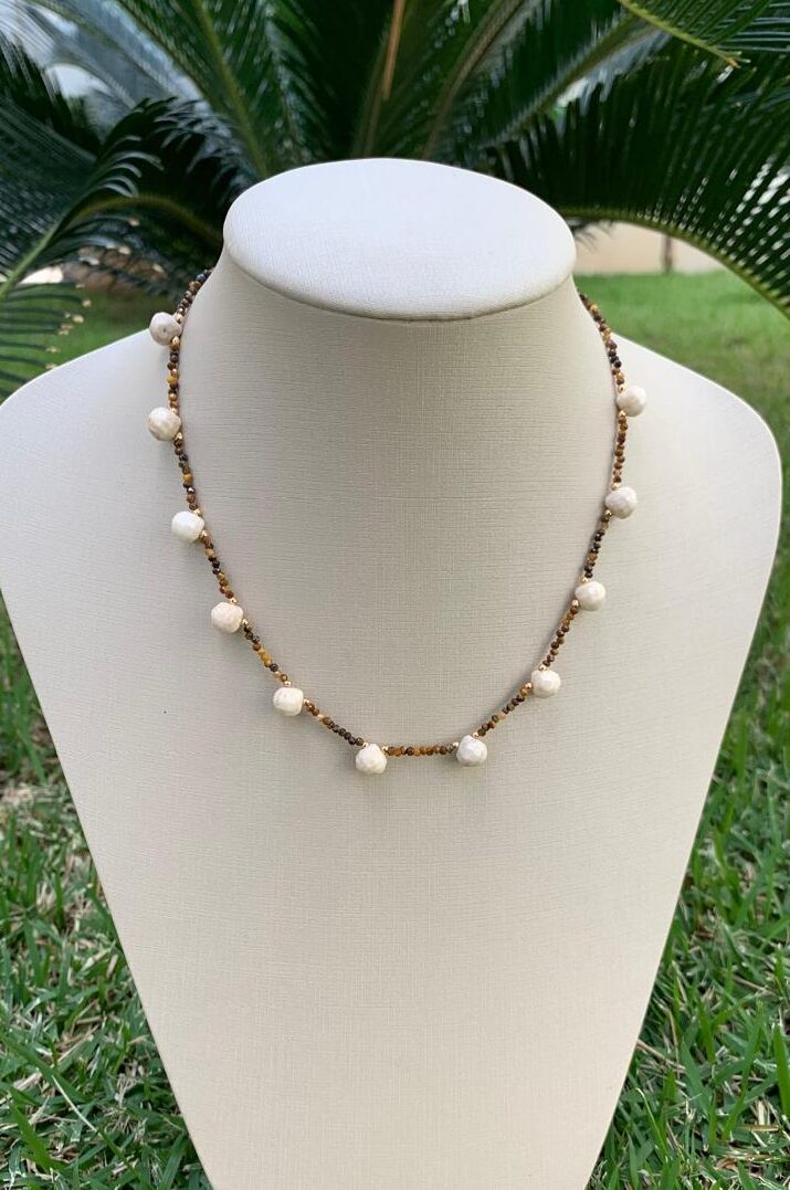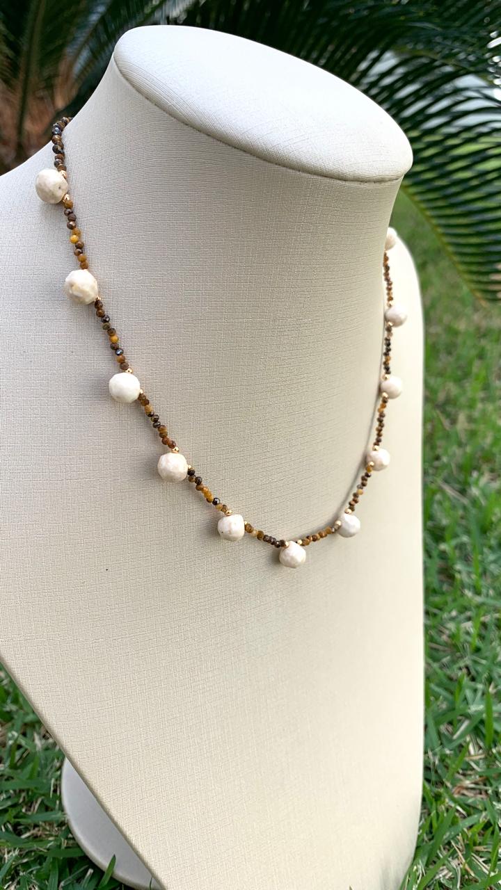 Colar olho de tigre com pingentes de amazonita bege, banhado a ouro 18k.