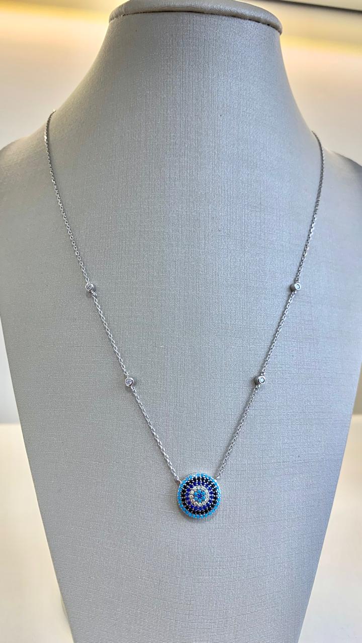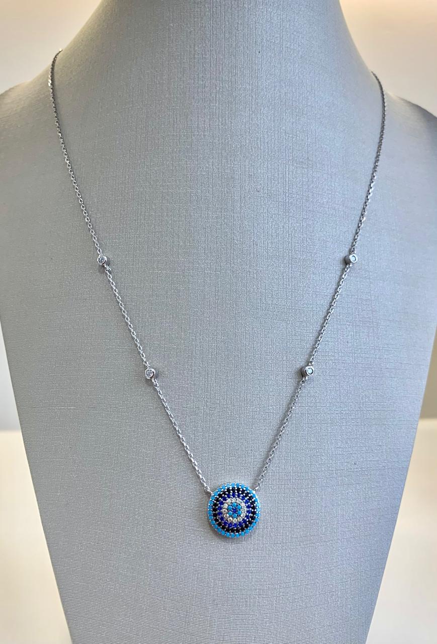 Colar de prata 925, com olho grego cravejado de zircônias azuis e corrente com pontos de luz.
