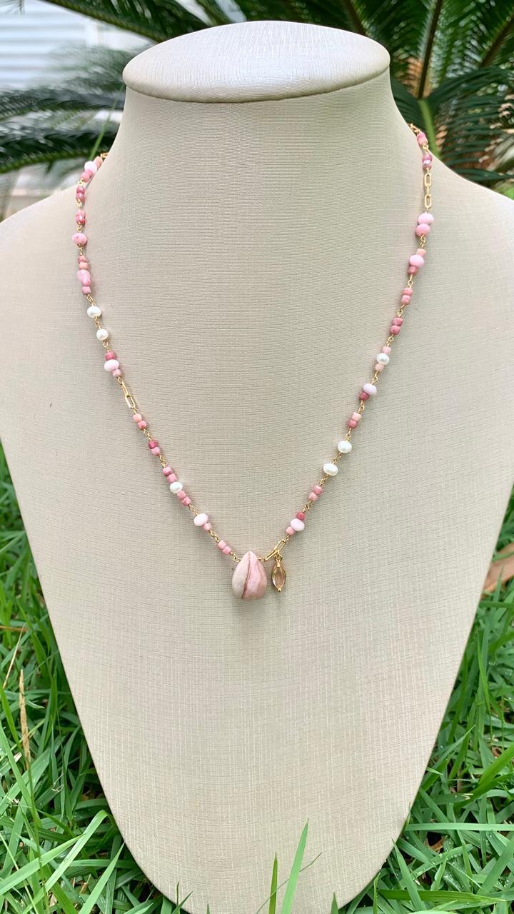 Colar opala rosa e dolomita com pérola natural, banhado a ouro18k.