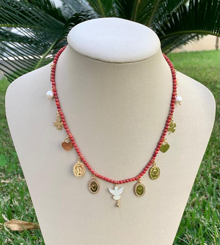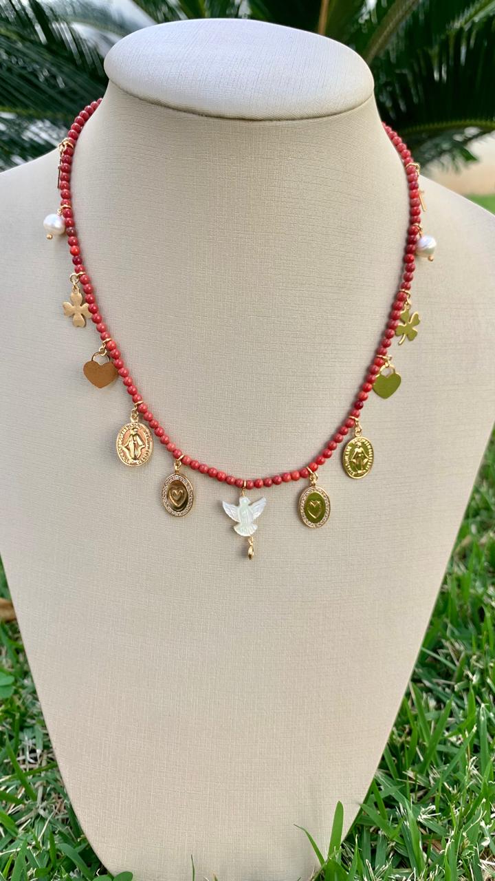 Colar pedra do sol com Espírito Santo em madrepérola e medalhas, banhado a ouro 18k.