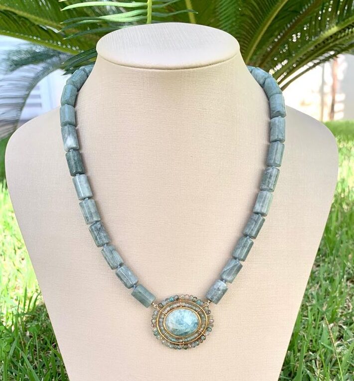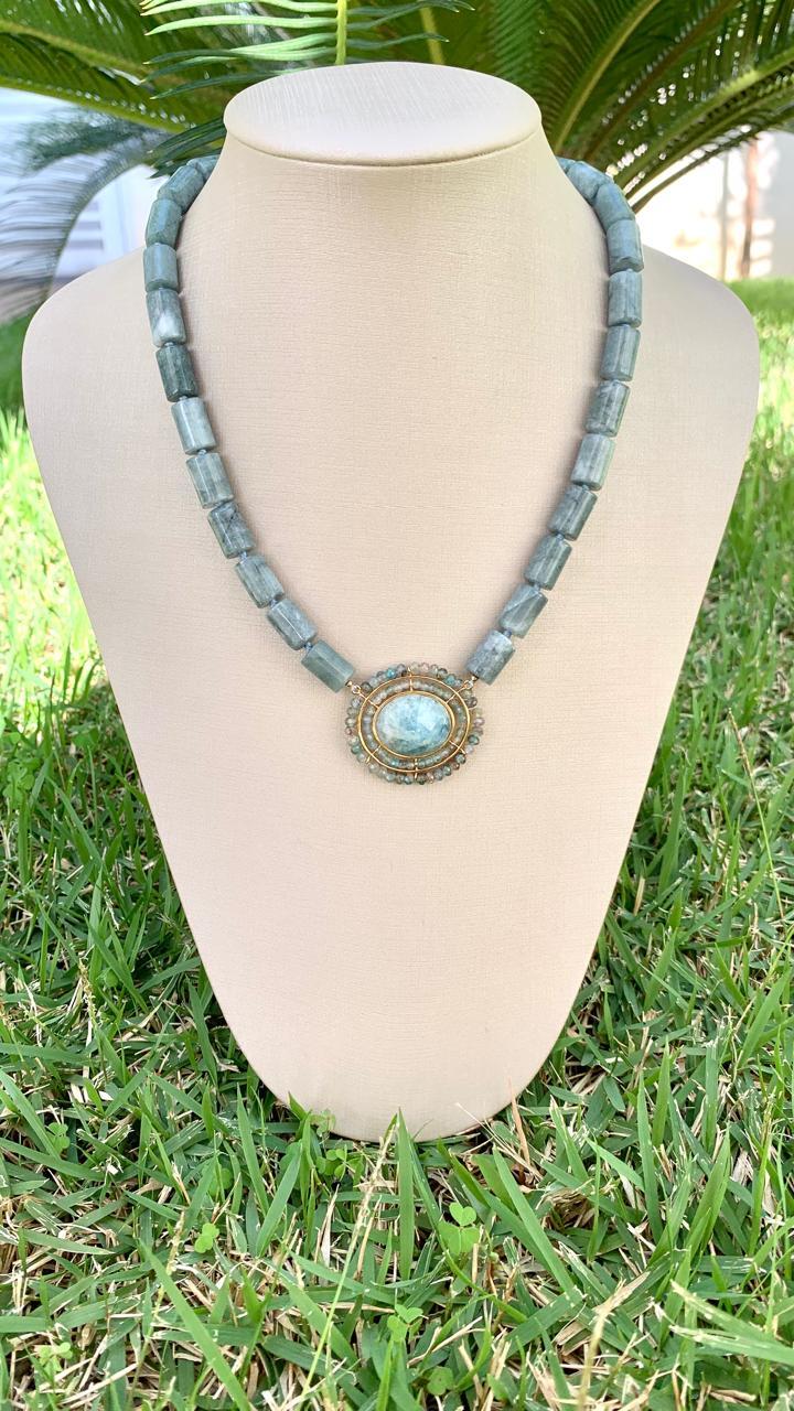 Colar pedra natural de água marinha, banhado a ouro18k.