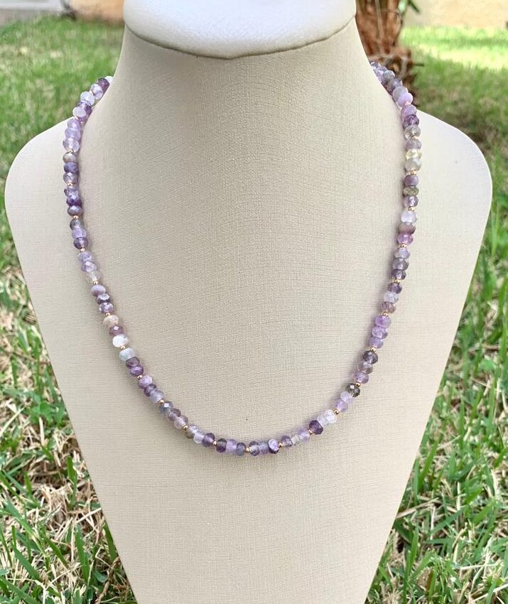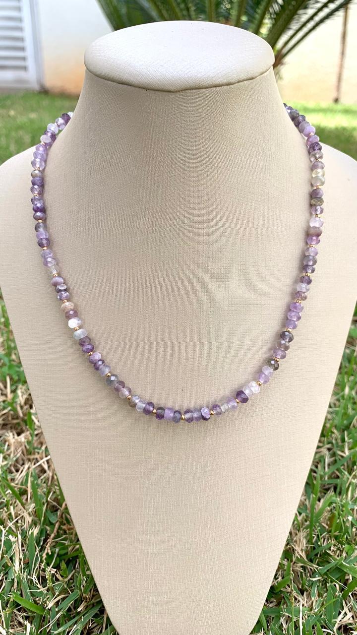 Colar pedra natural ametista, banhado a ouro 18k.