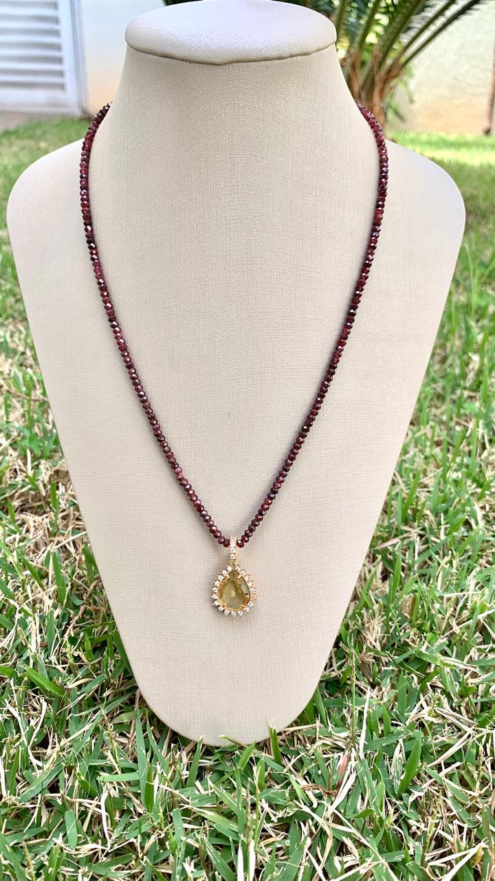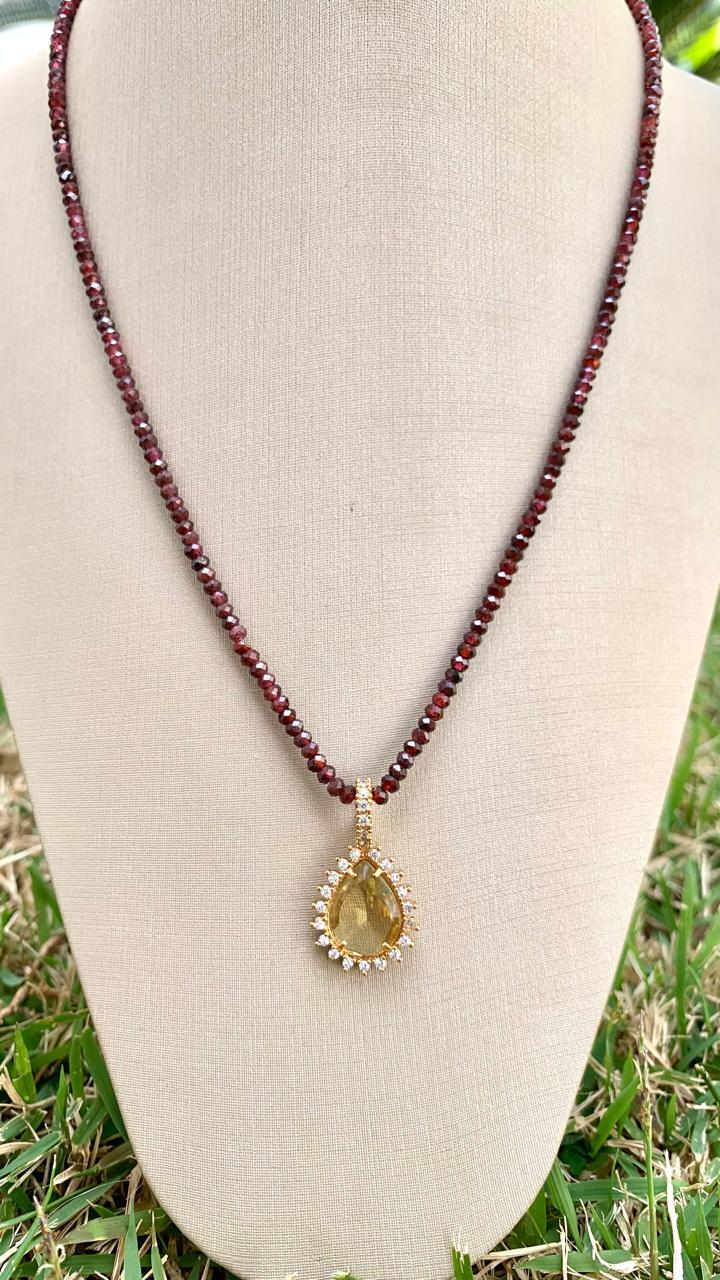 Colar pedra natural granada com pingente gota green gold cravejado com zircônias brancas, banhado a ouro 18k.
