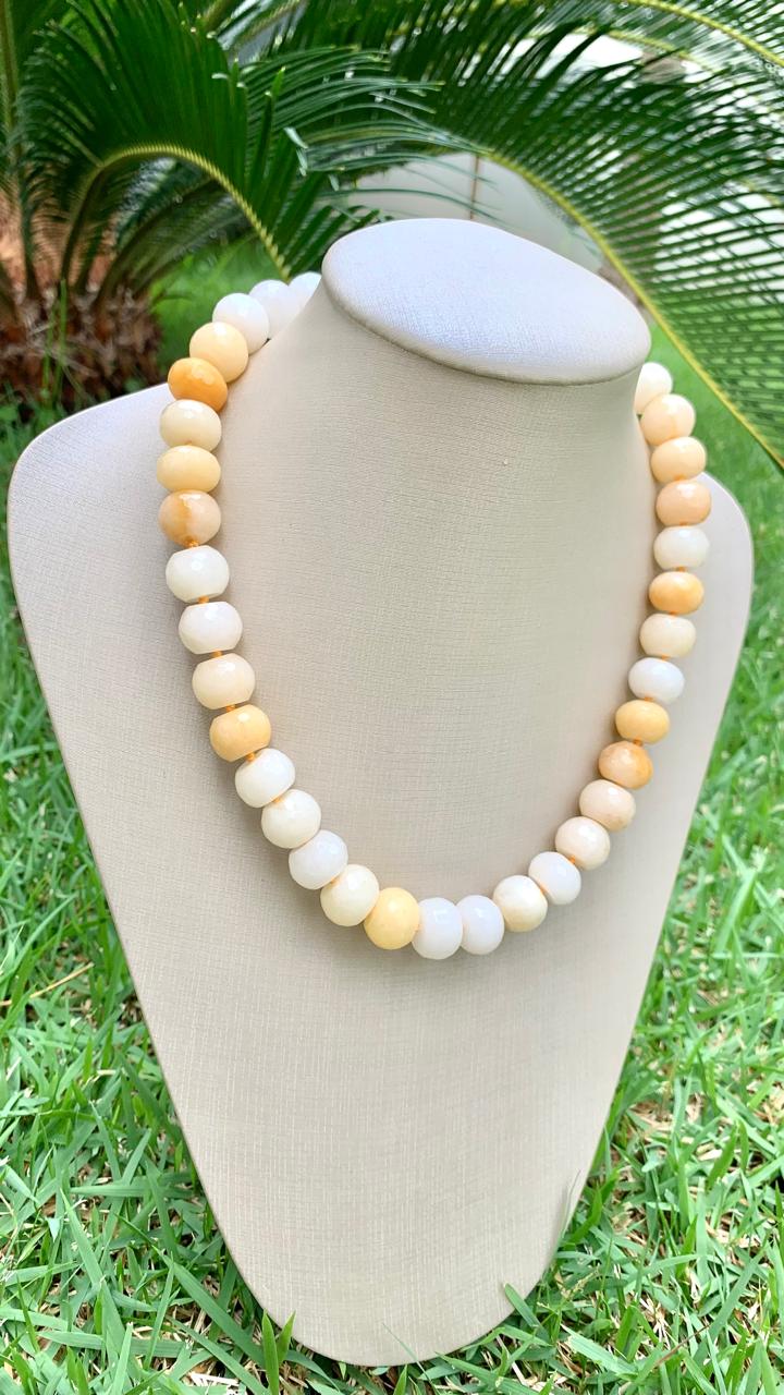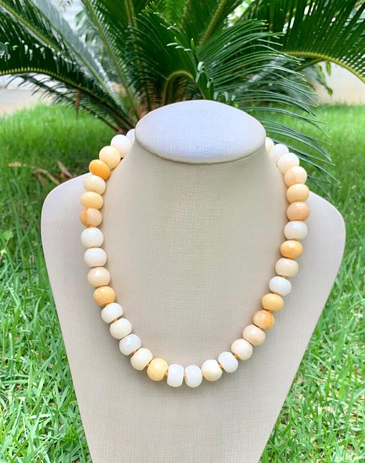 Colar com 45cm de comprimento, de pedra natural calcita, banhado a ouro 18k. Fecho lagosta.