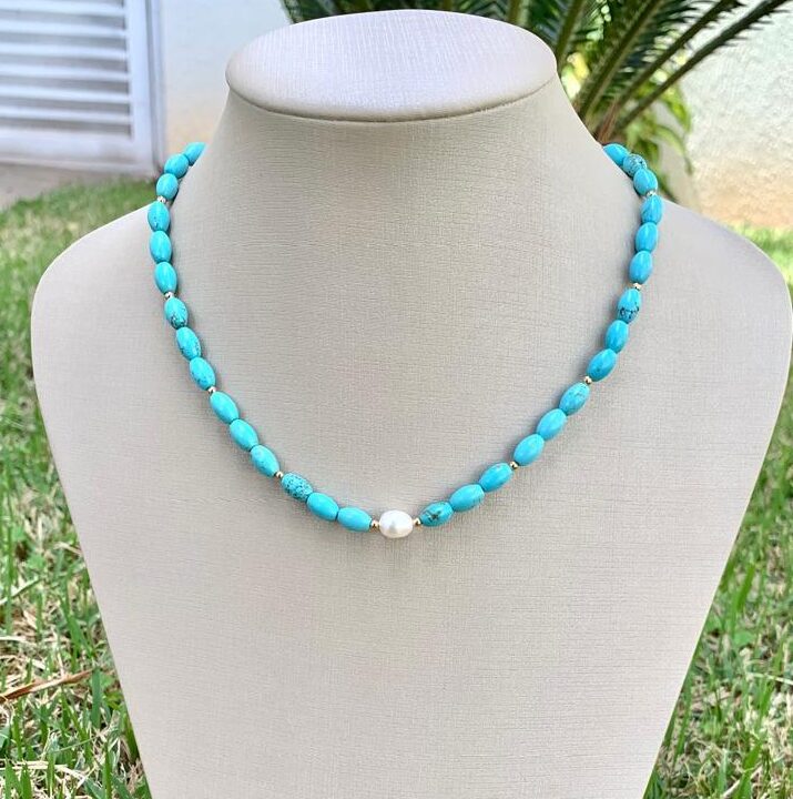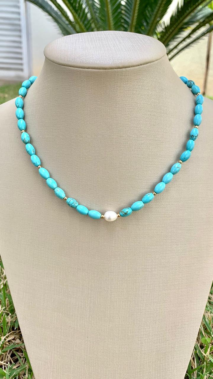 Colar pedras naturais howlita turquesa e pérola, banhado a ouro 18k.