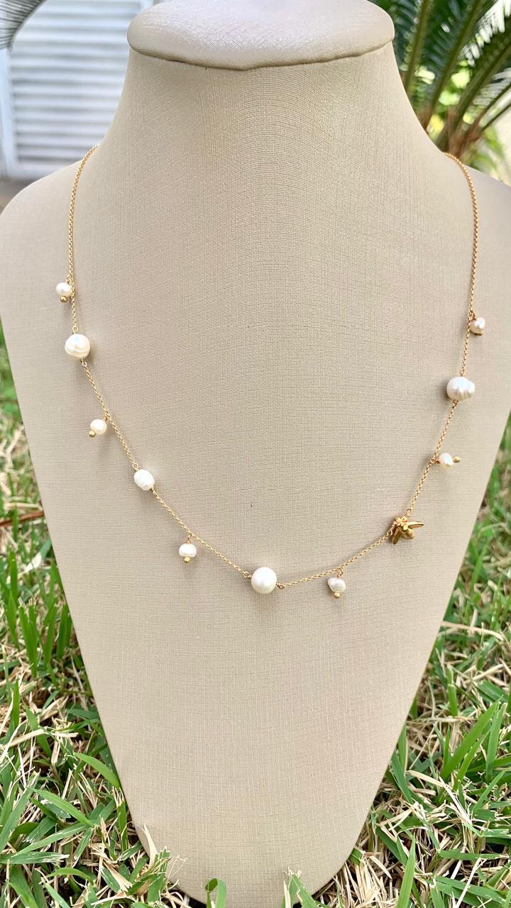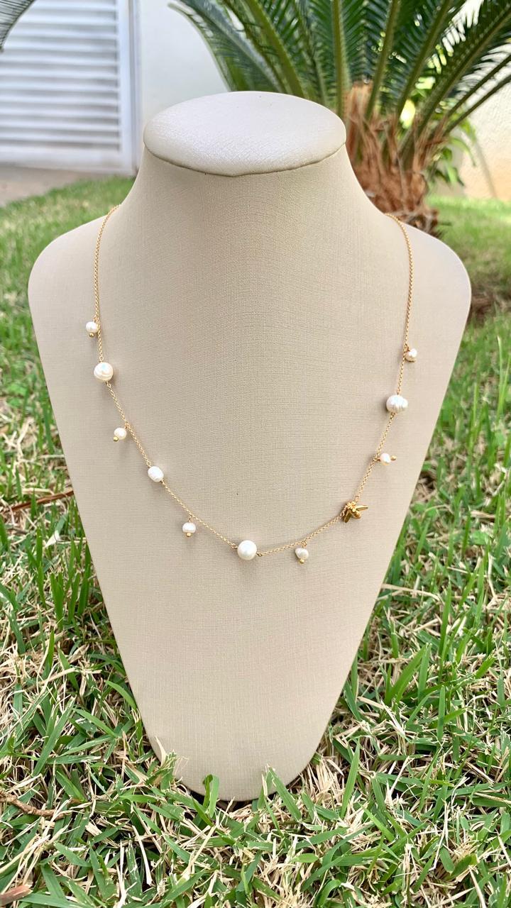 Colar pérola com mini abelha, banhado a ouro 18k.