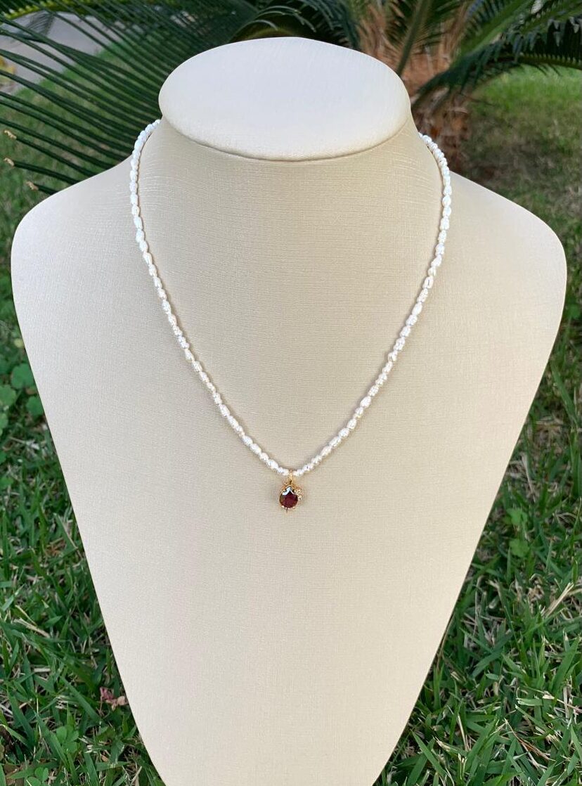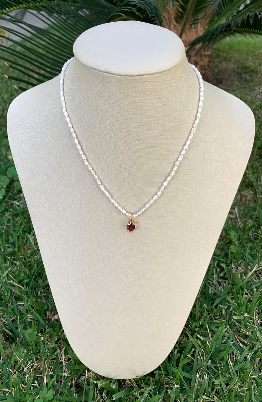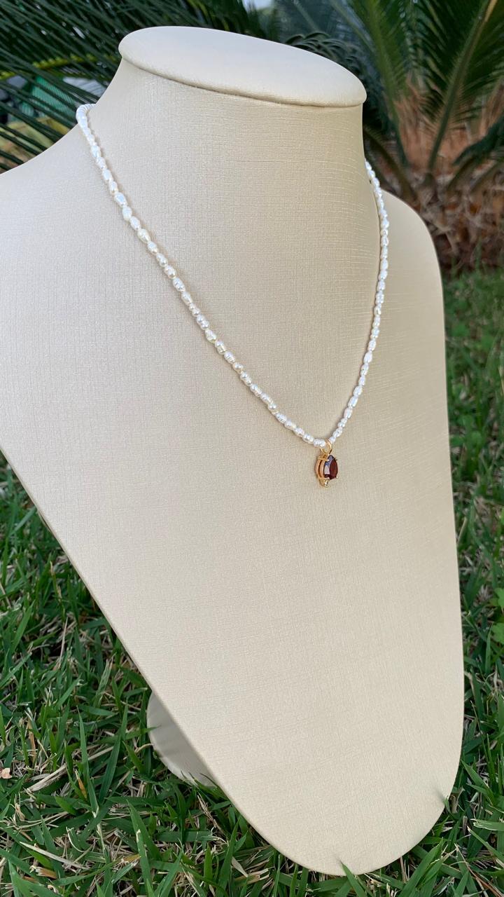 Colar pérola arroz, com pingente gota de granada, banhado a ouro 18k.