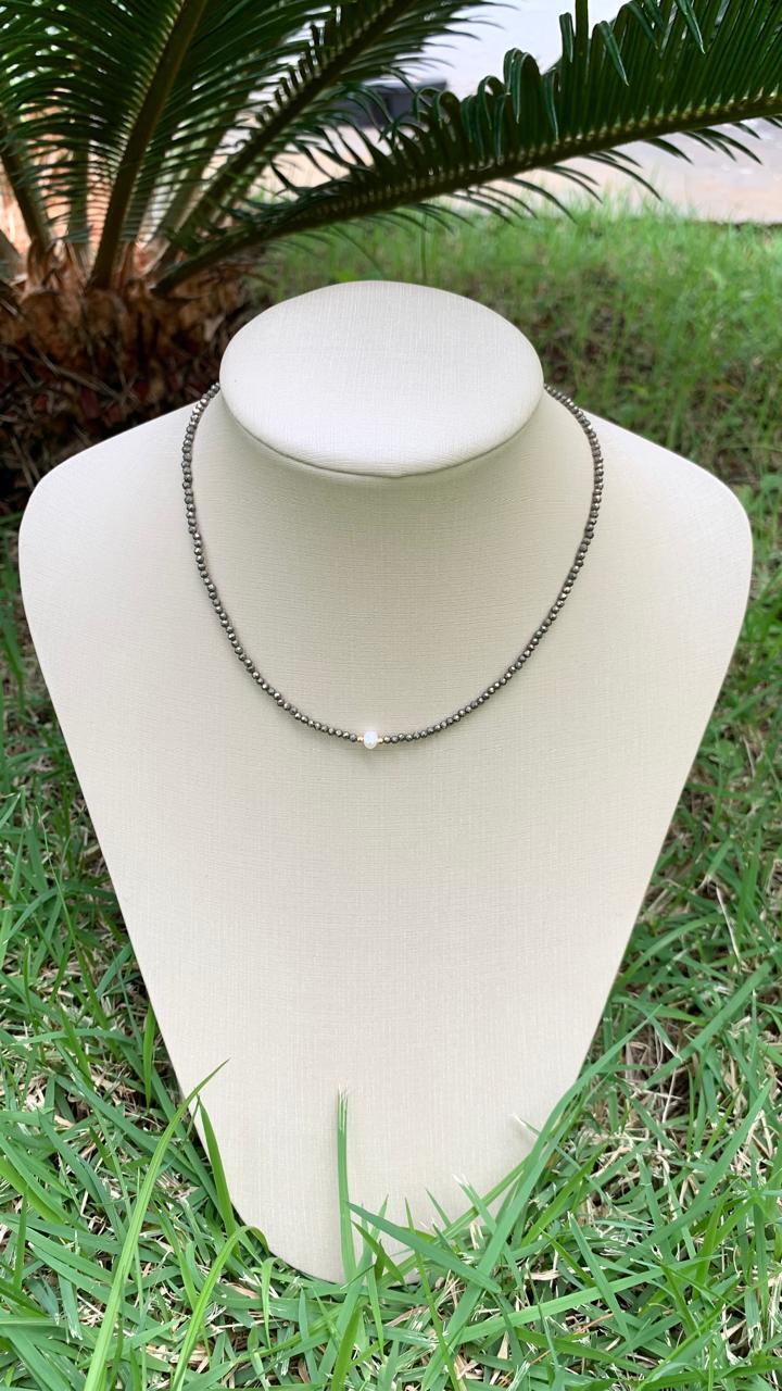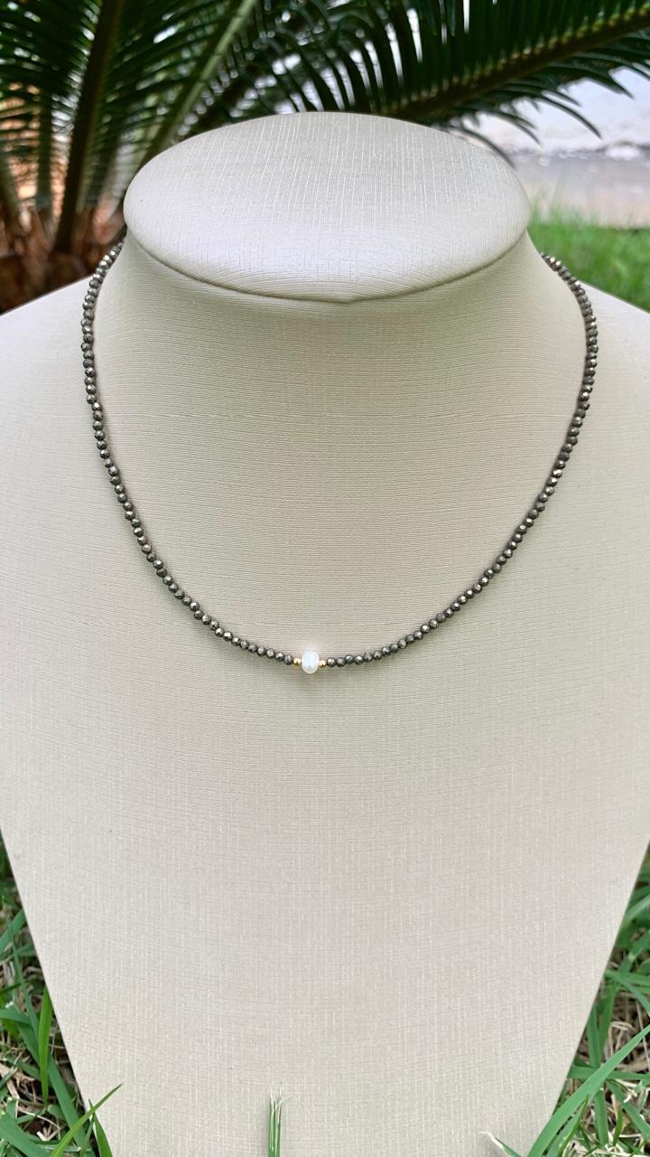 Colar de pirita com mini pérola, banhado a ouro18k.