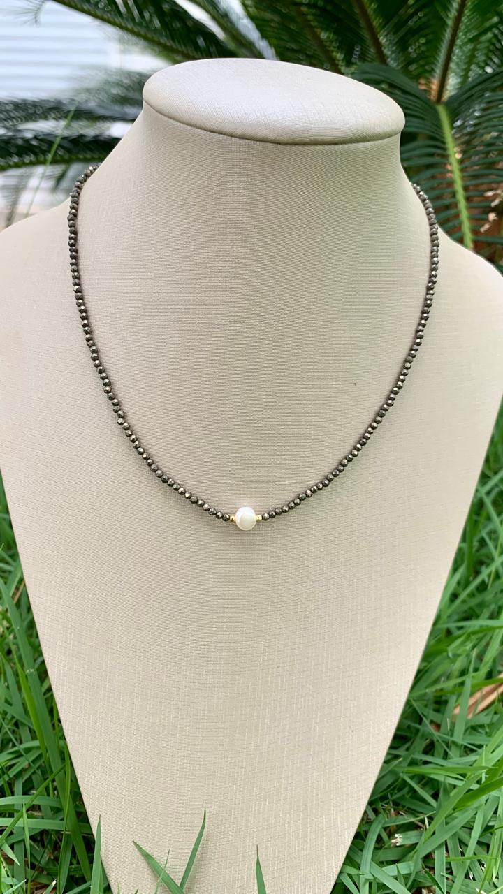 Colar de pedra natural pirita com pingente de pérola, banhado a ouro18k.