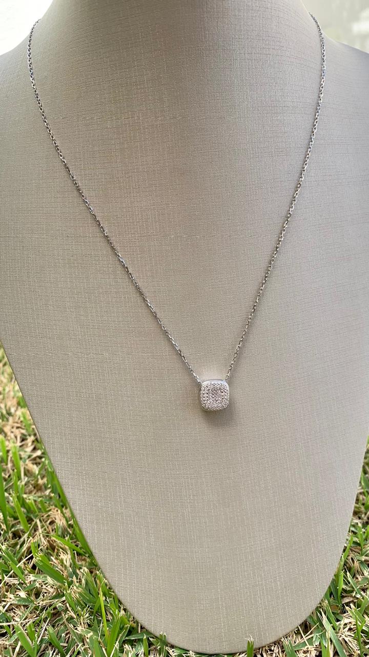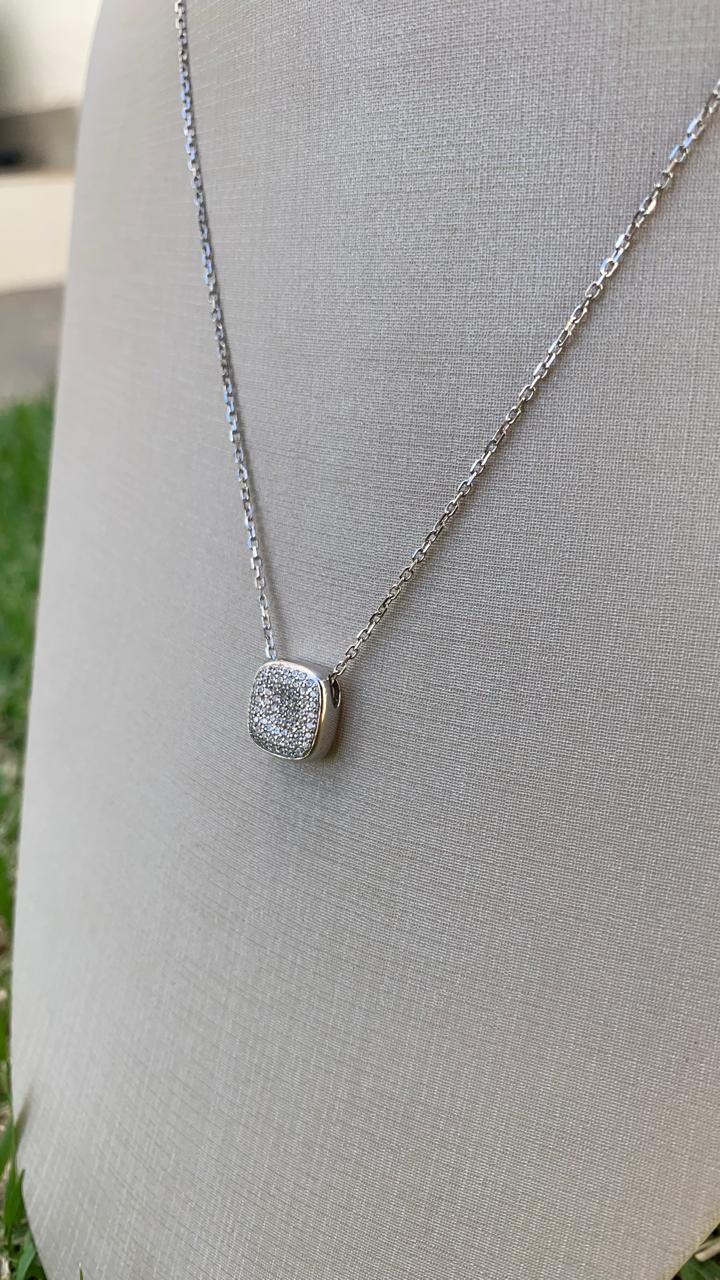Colar de prata 925, com pingente quadrado cravejado de zircônias e corrente com elos portugueses.