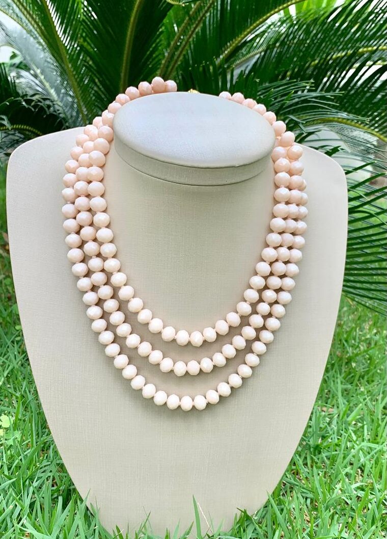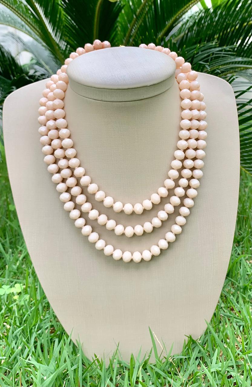 Colar com três voltas de pedra natural de quartzo rosa, com banho de ouro 18k.