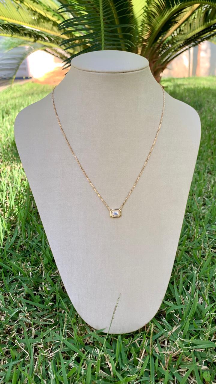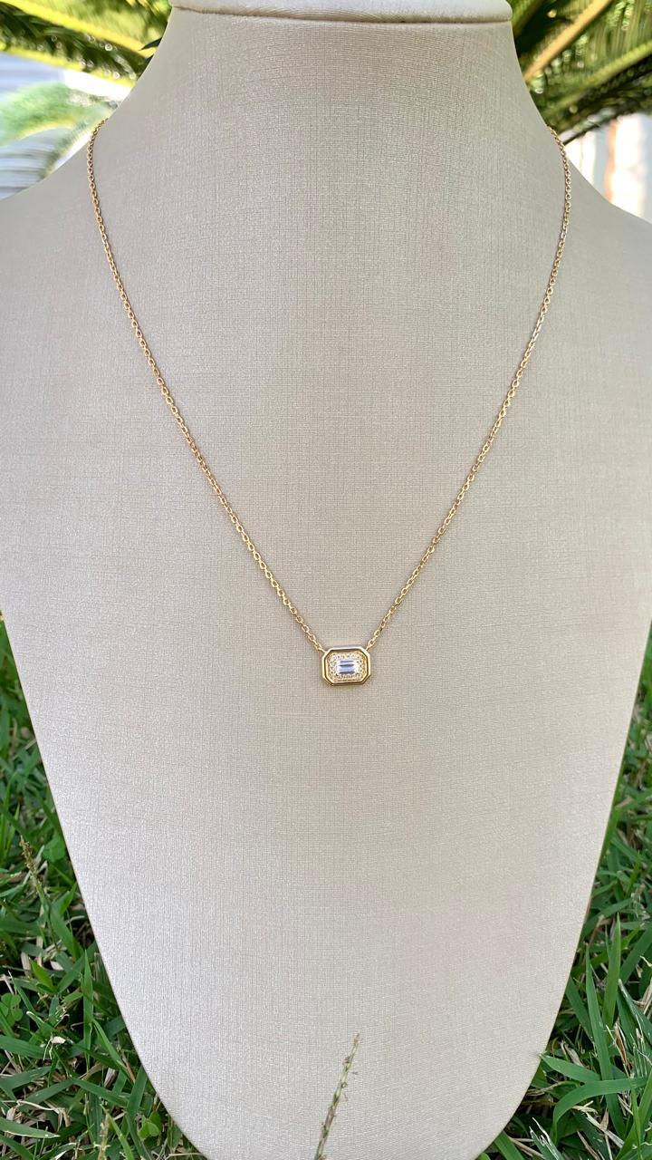 Colar retangular com Zircônias brancas, em prata 925 e banho de ouro18k.