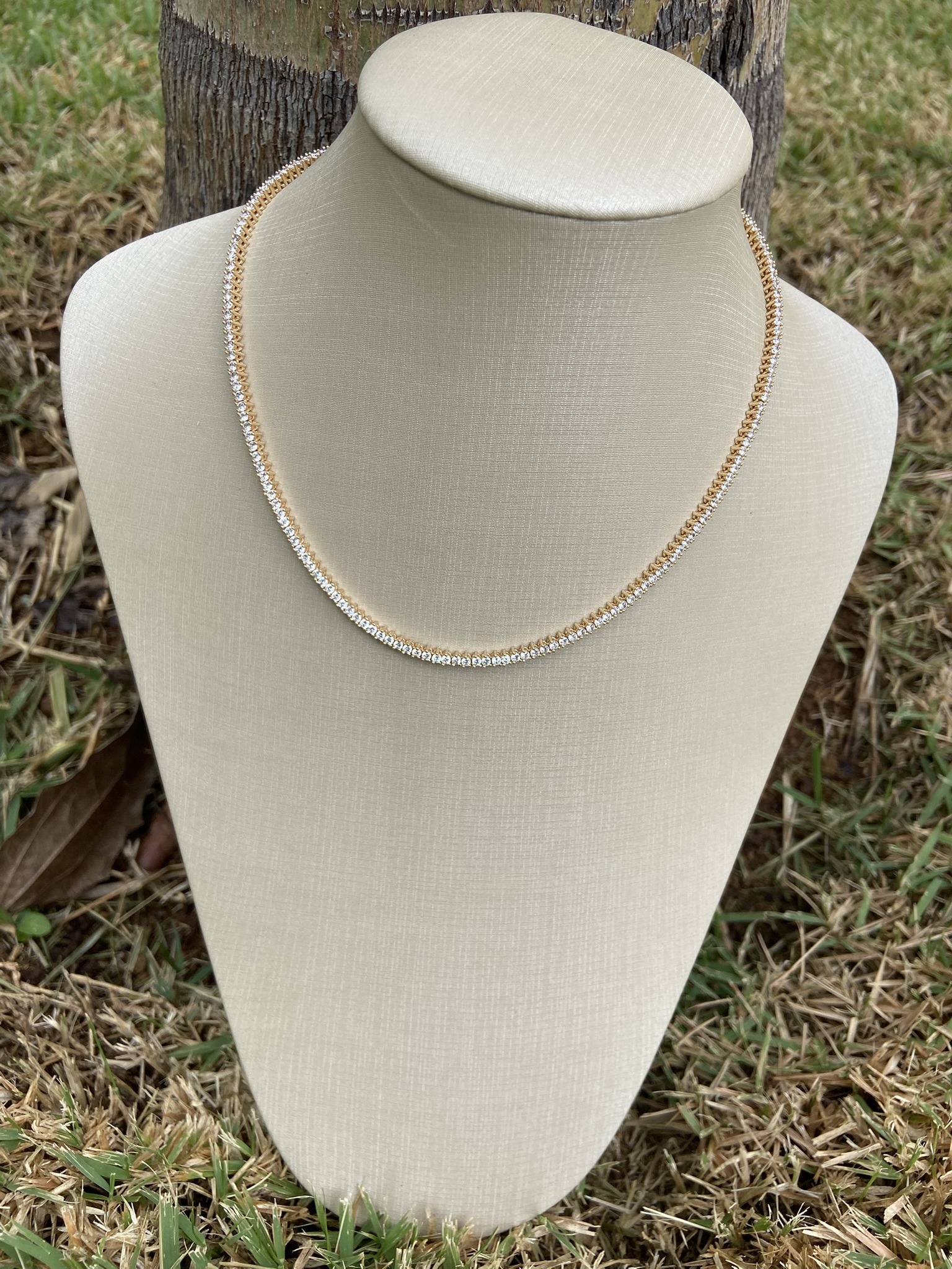 Colar riviera, com 40cm de comprimento, cravação de 2mm e 4 pontos, banhado a ouro 18k.