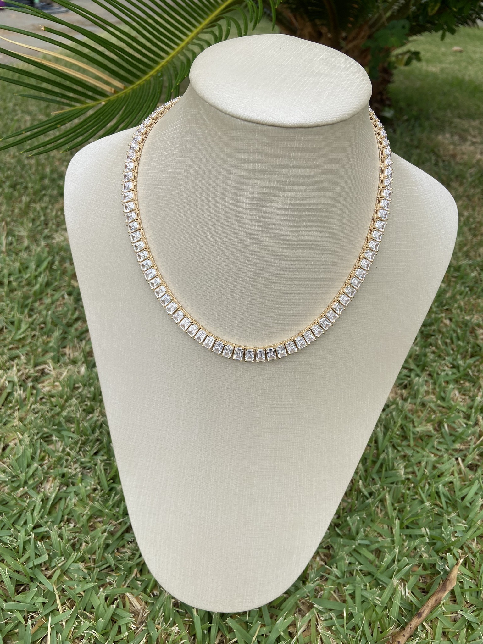 Colar riviera com baguetes, com 40cm de comprimento, banhada a ouro18k.