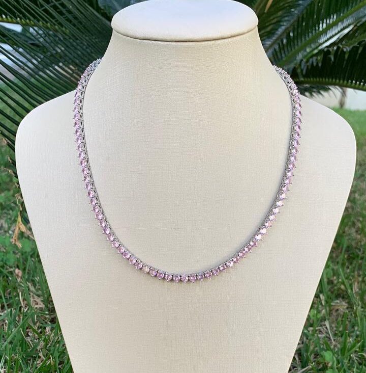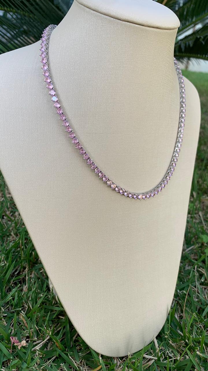 Colar riviera com zircônia rosa, com 45cm de comprimento, em ródio branco. Fecho gaveta.