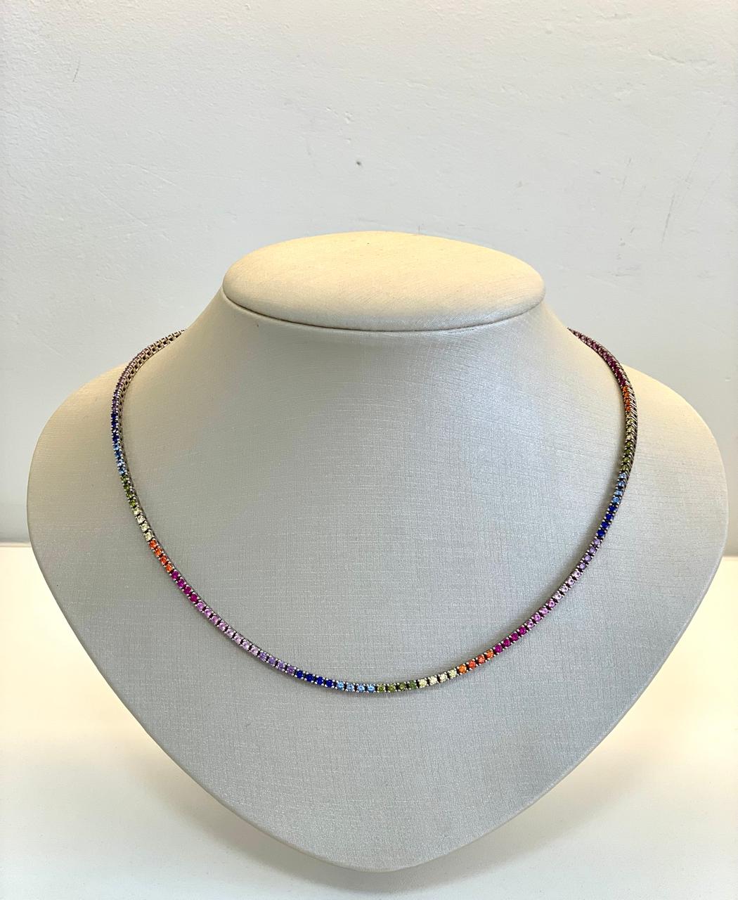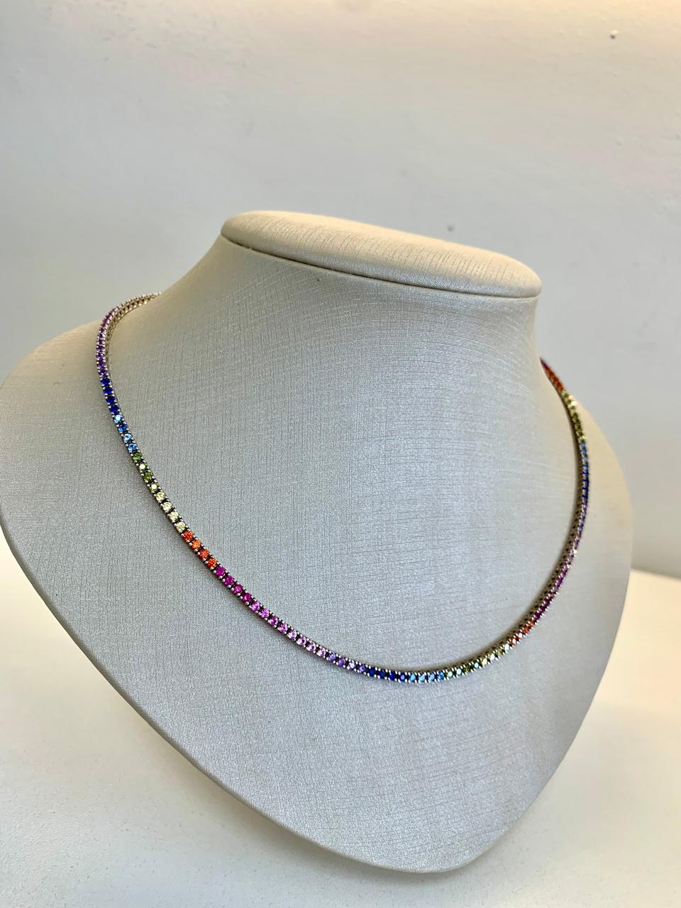 Colar Riviera de prata 925, cravejado de zircônias coloridas.