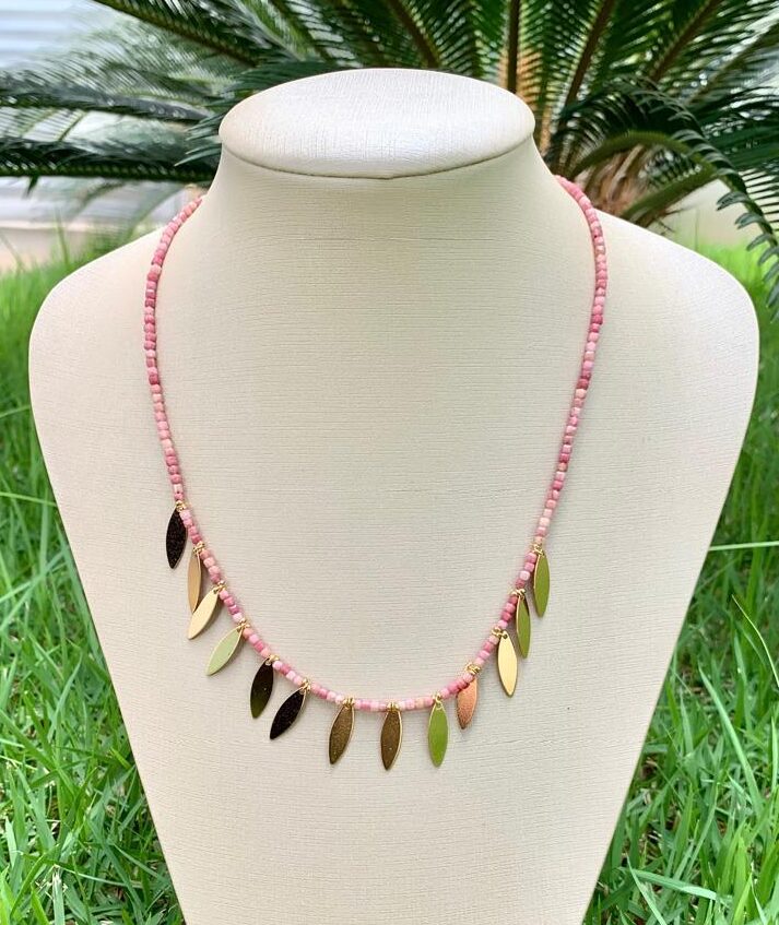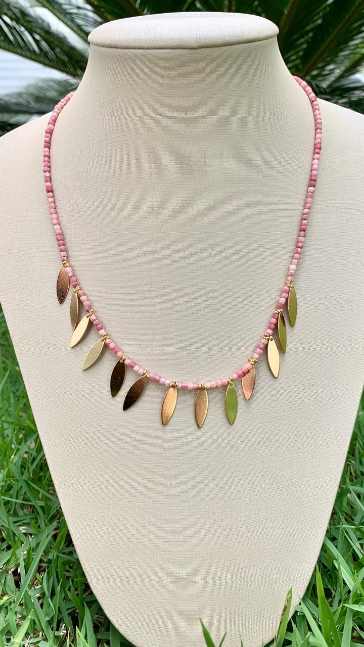 Colar de pedra natural rodocrosita com pingentes de folhas, banhado a ouro18k.