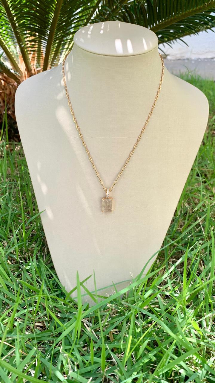 Colar elos, com pingente de pedra natural de rútilo, cravejado com zircônias brancas, com 40cm de comprimento, banhado a ouro18k.