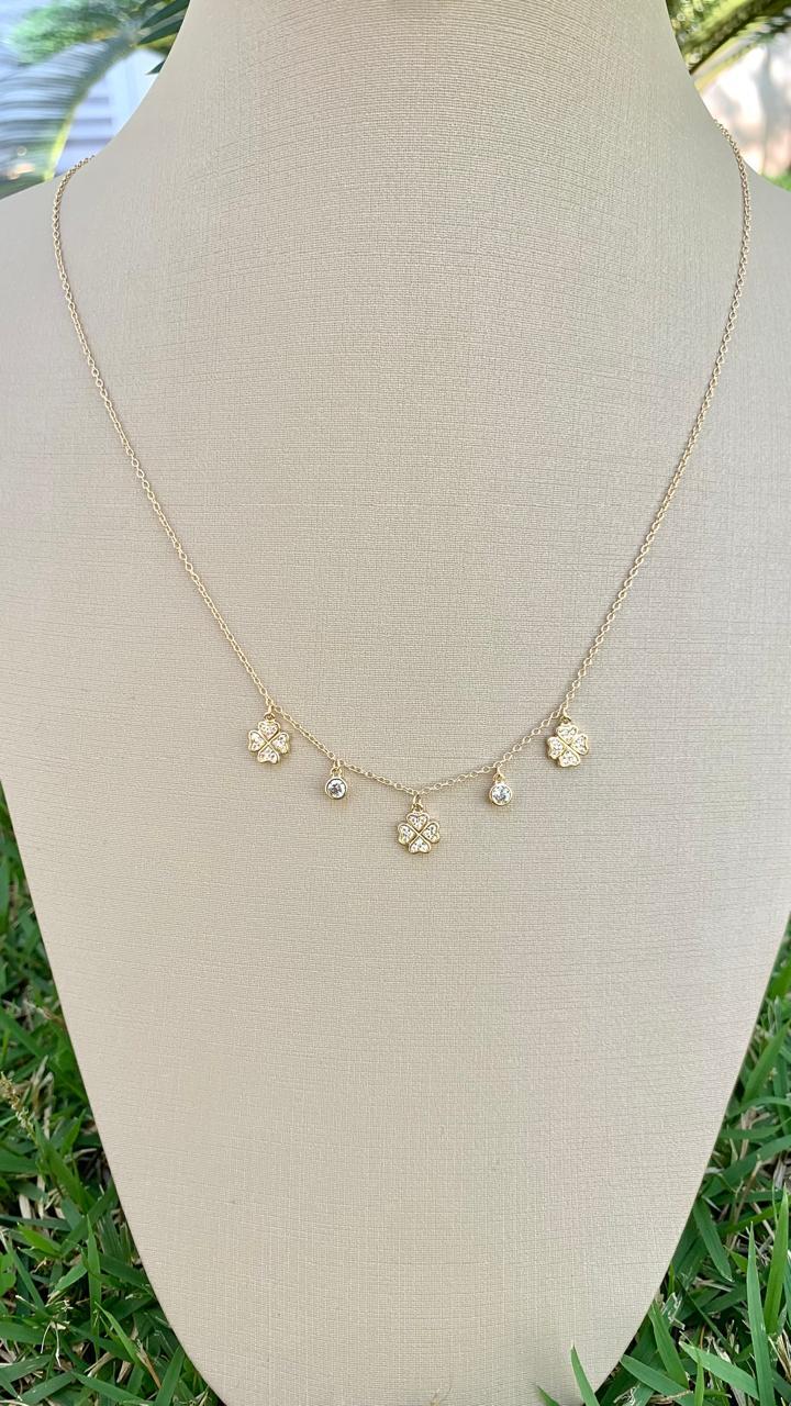 Colar trevo 4 pétalas em formato de coração, em prata 925 e banho de ouro 18k.