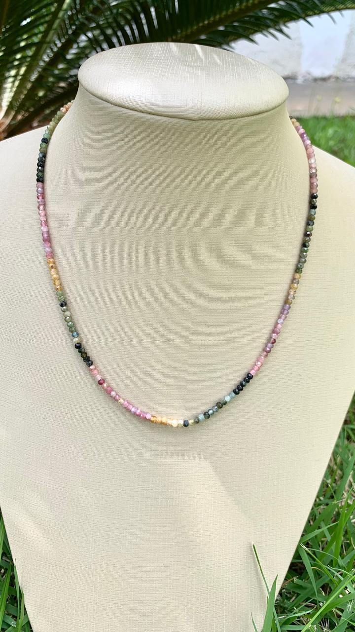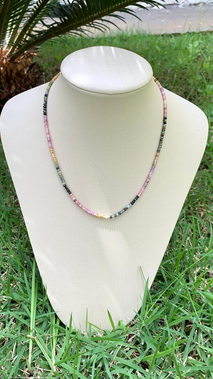 Colar de pedra natural turmalina melancia, 39cm, banhado a ouro18k.