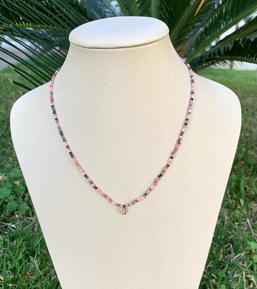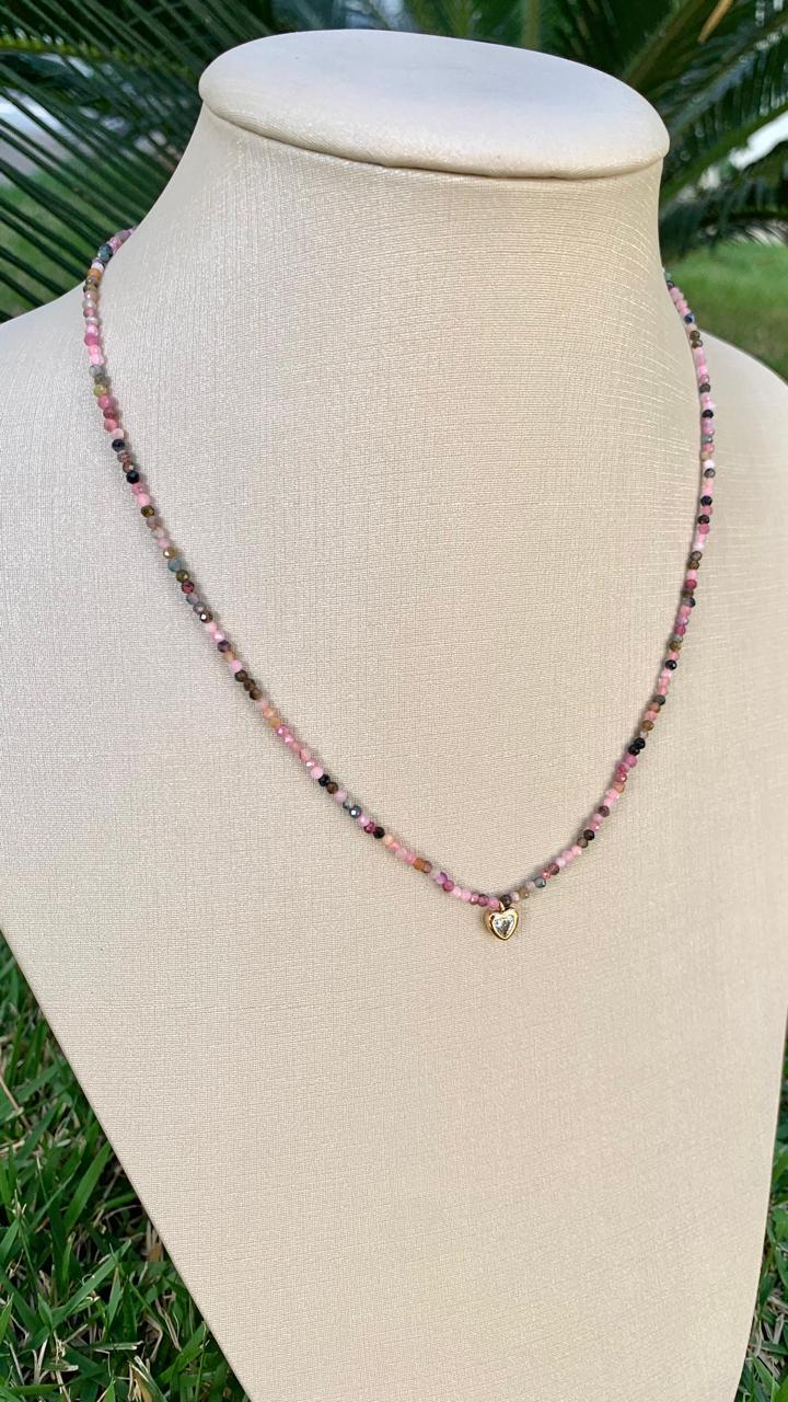 Colar de turmalina rosa com mini coração, banhado a ouro 18k.
