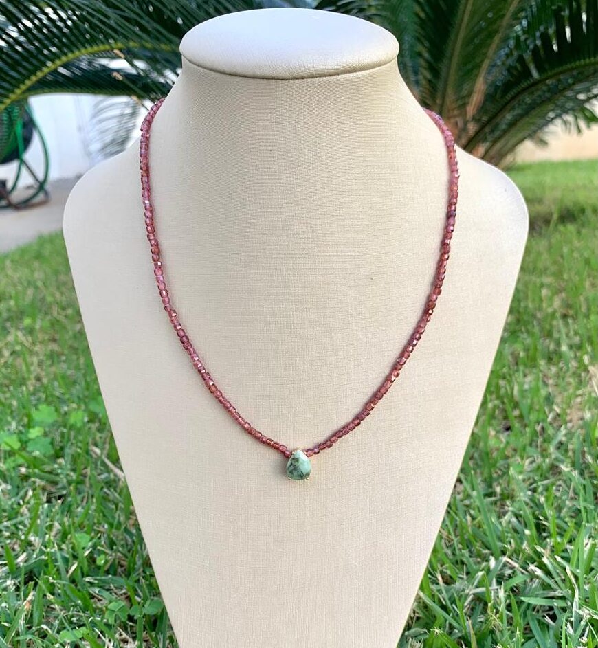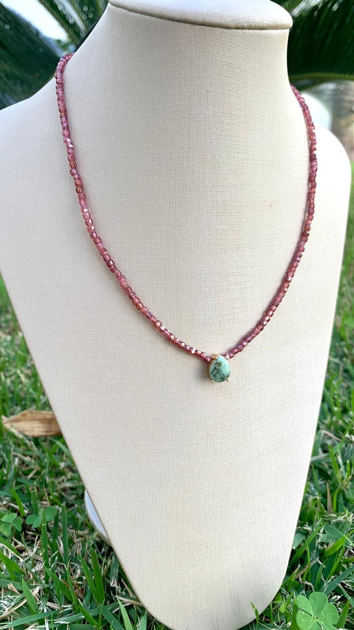 Colar com 40cm de comprimento, de turmalina rosa com gota de esmeralda, banhado a ouro 18k.