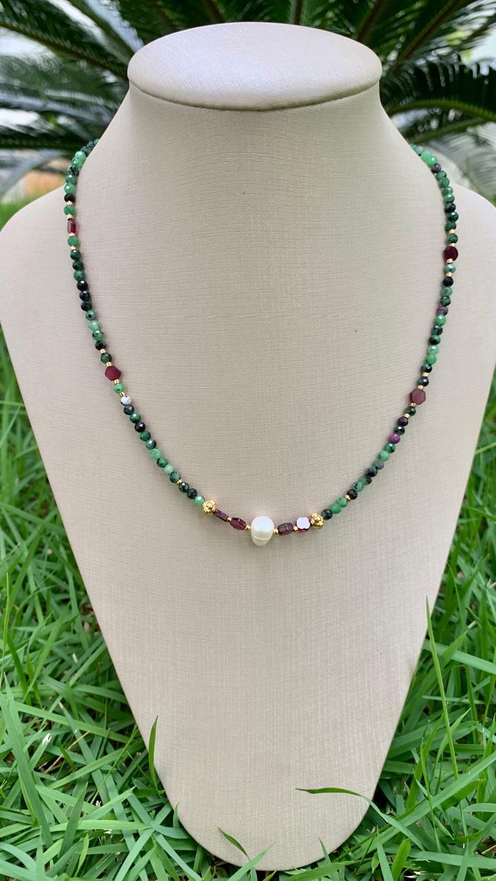 Colar de pedras naturais zoesita com rubi indiano e pérola, banhado a ouro18k.