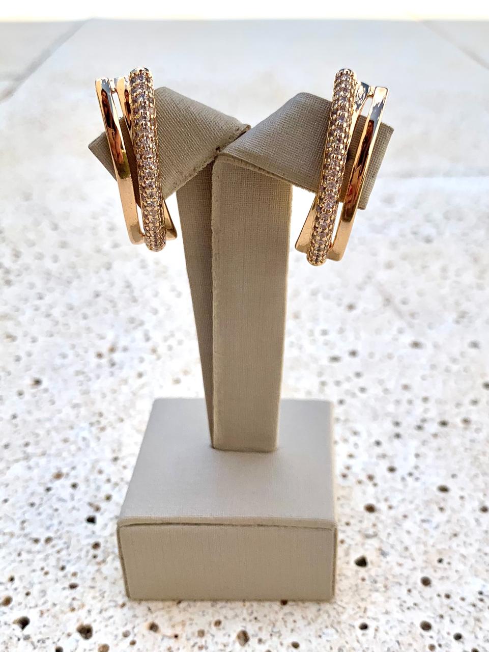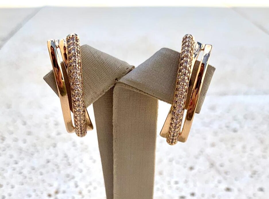 Brinco ear hook com zircônias, com banho de ouro rose.