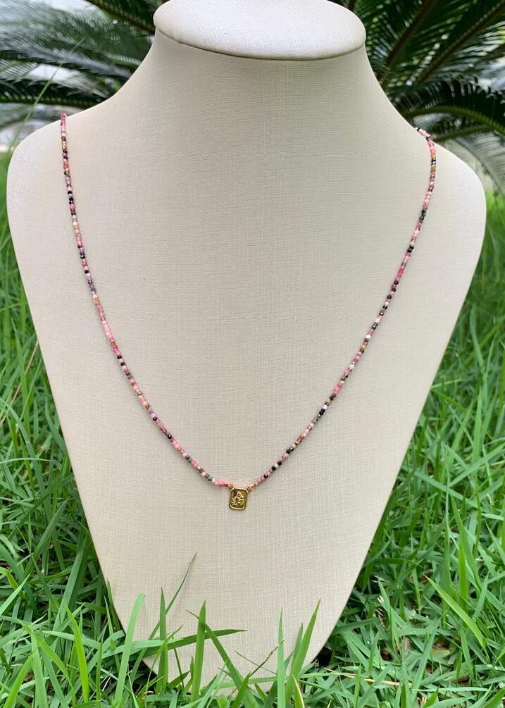 Escapulário com 70cm de comprimento, de turmalina rosa, com Nossa Senhora das Graças, banhado a ouro 18k.