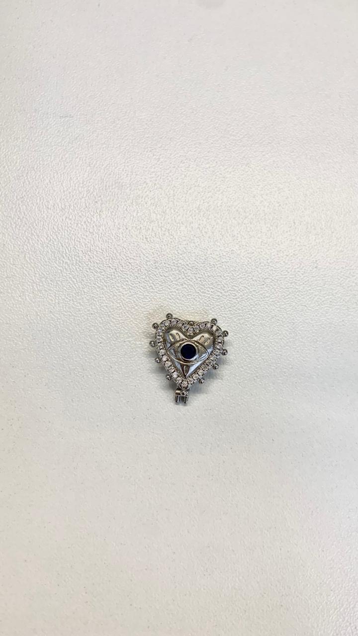 Pin coração com olho grego e zircônias ao redor, em ródio branco.