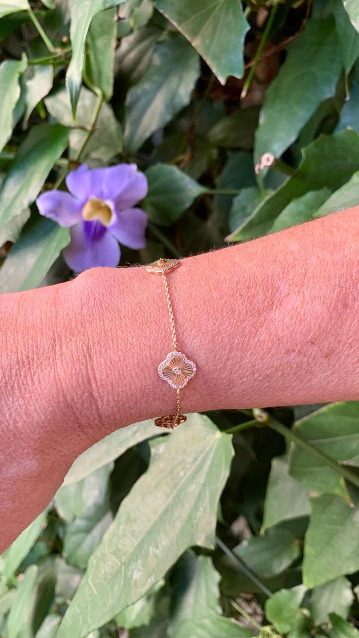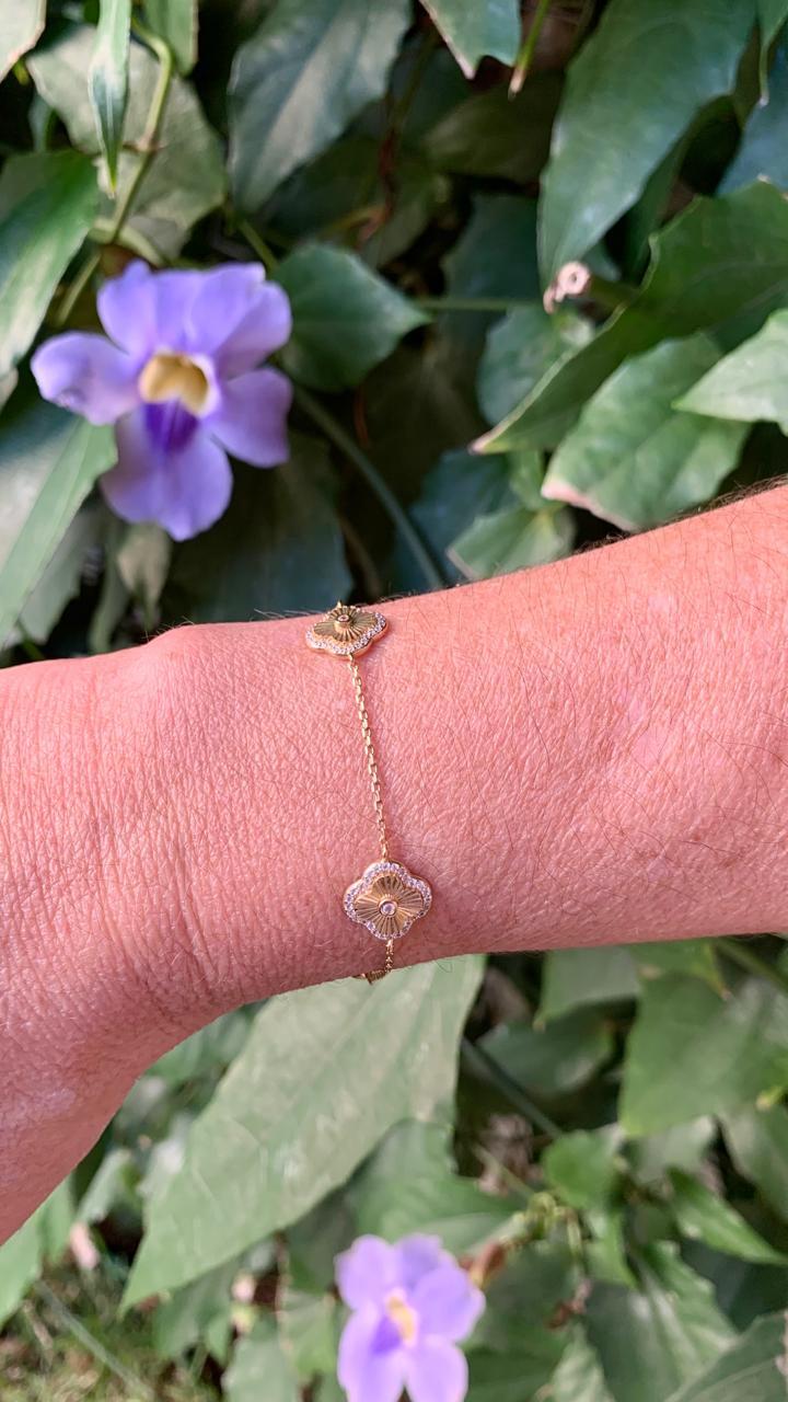 Pulseira 4 pétalas cravejada com zircônias brancas, com 17cm, em prata 925 e banho de ouro 18k.