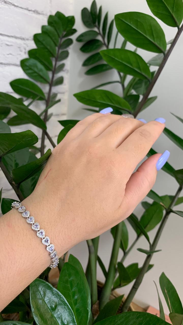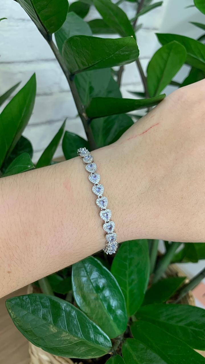 Pulseira riviera corações de tanzanita 4mm, com 17cm, em ródio branco.